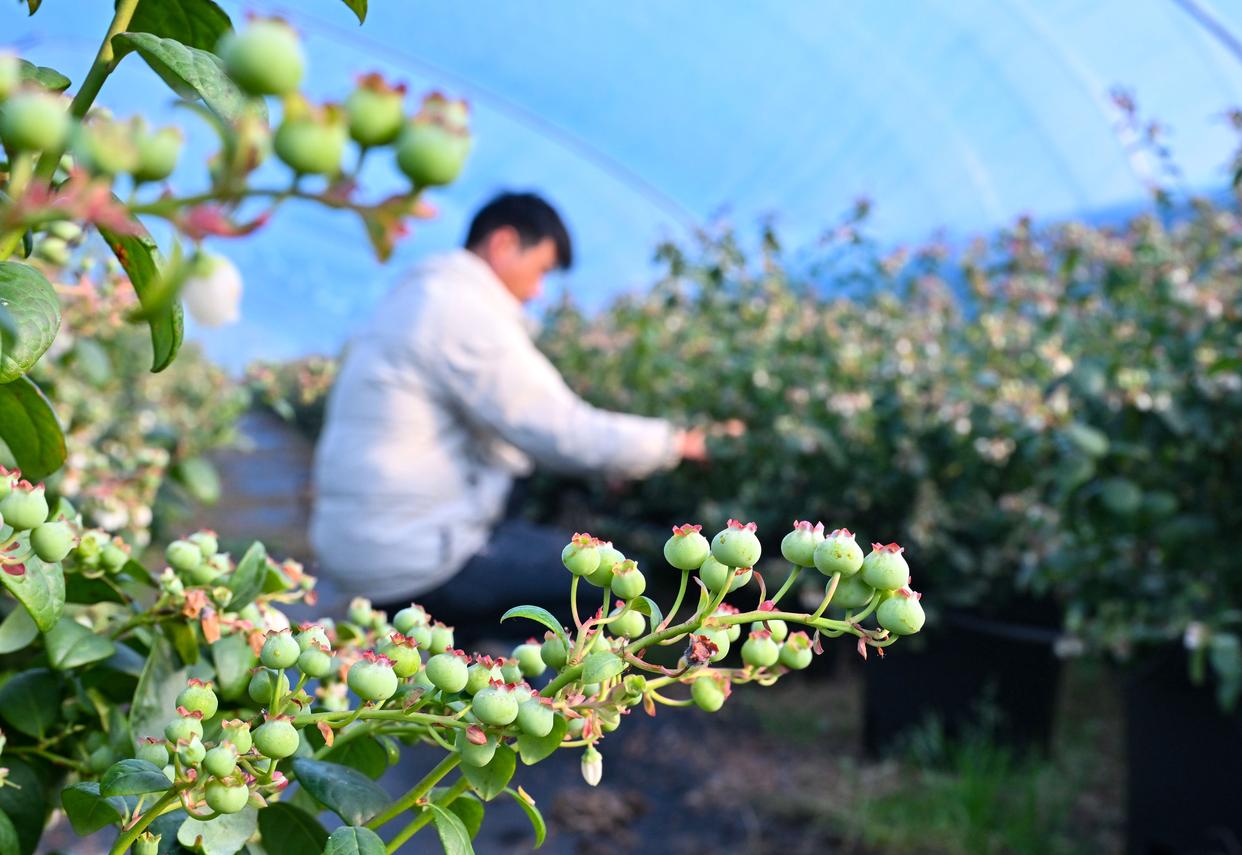 2月4日,在安徽省淮南市田家庵区曹庵镇农博生态园内,农民在管护蓝莓。新华社发(陈彬摄)