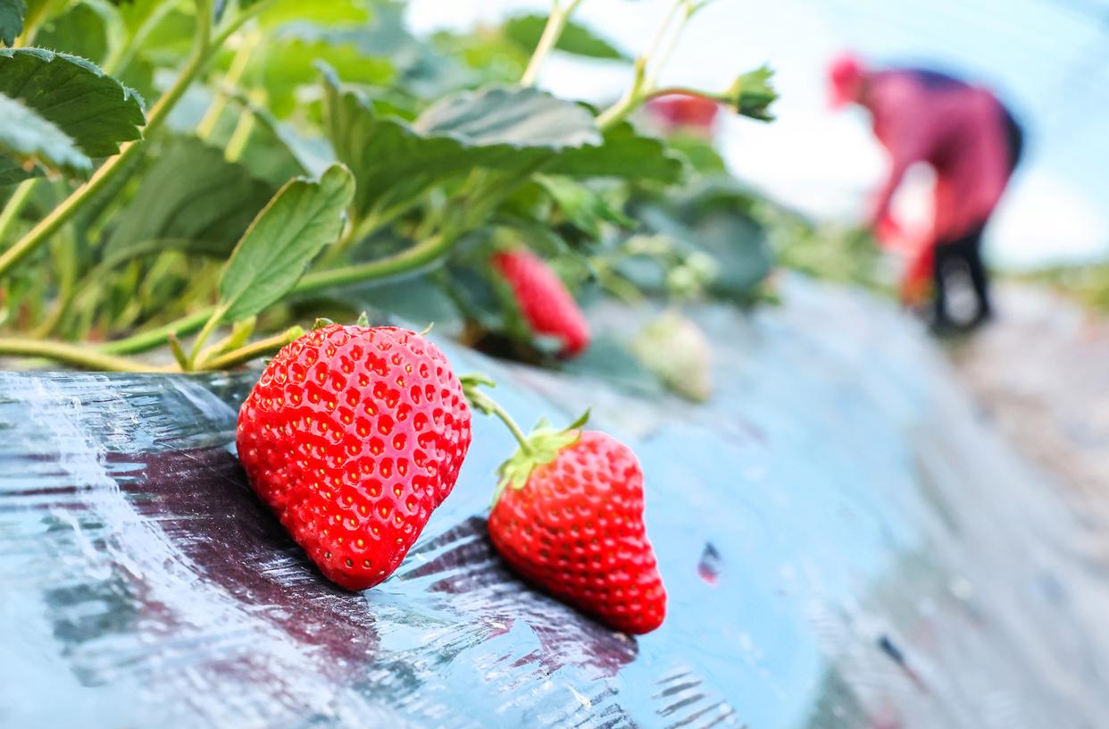 2月4日,在江苏连云港经济技术开发区朝阳街道西庄村一处大棚里,农民在采摘草莓。新华社发(王健民摄)
