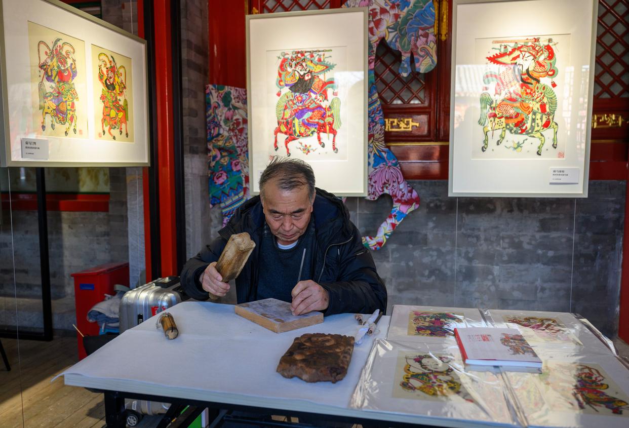 2月4日,国家级非物质文化遗产项目凤翔木版年画代表性传承人邰立平在展览现场雕版。新华社记者 金良快 摄