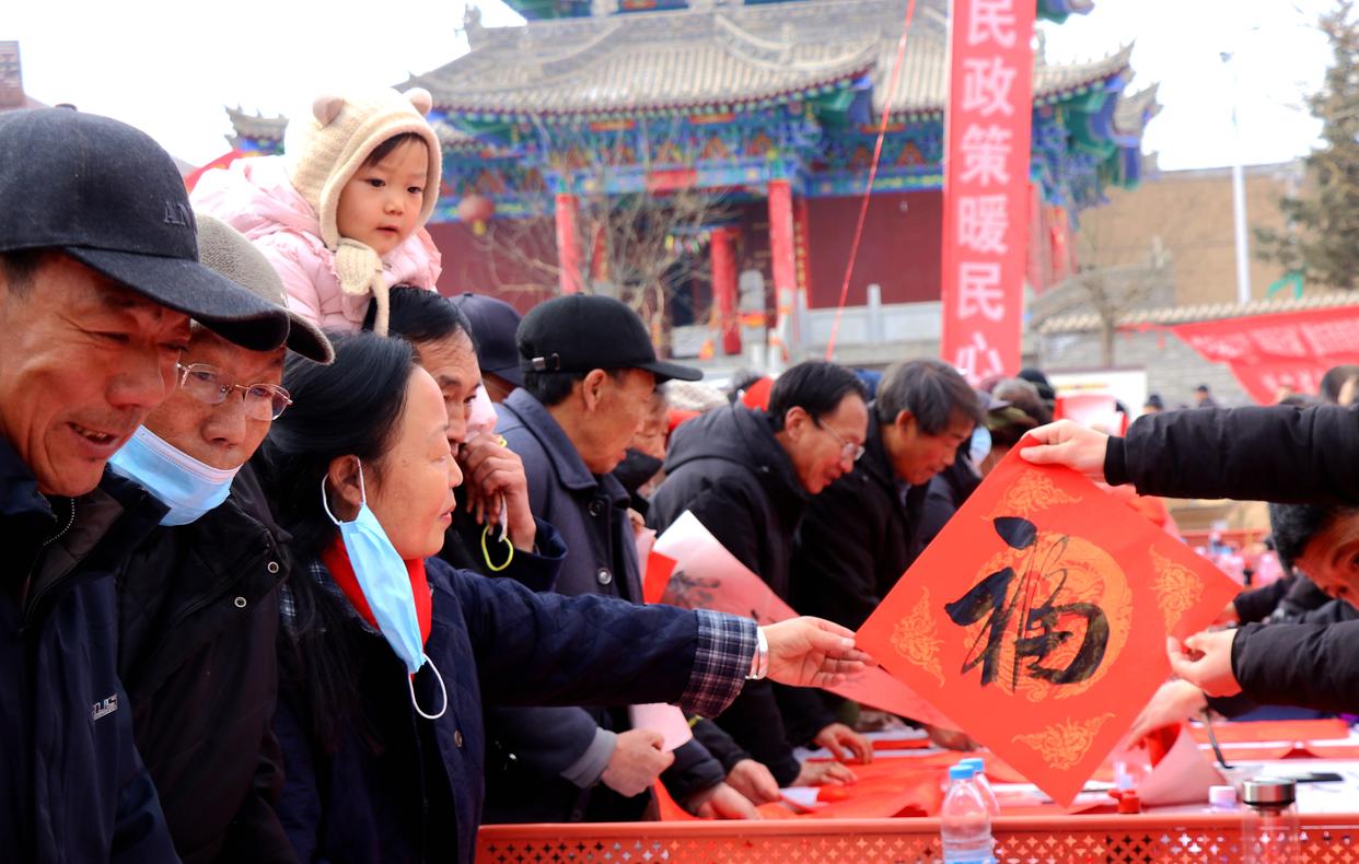 2月5日,在甘肃省平凉市静宁县甘沟镇农贸市场,村民在领春联和福字。新华社发(王毅摄)