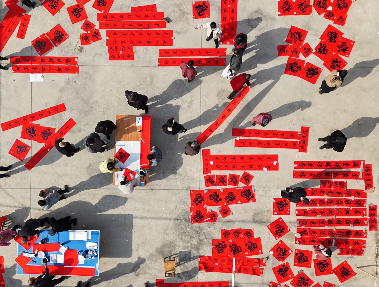 2月4日,在江西省宜春市樟树市经楼镇老农贸市场,专业书法老师为群众书写春联(无人机照片)。新华社发(周亮摄)