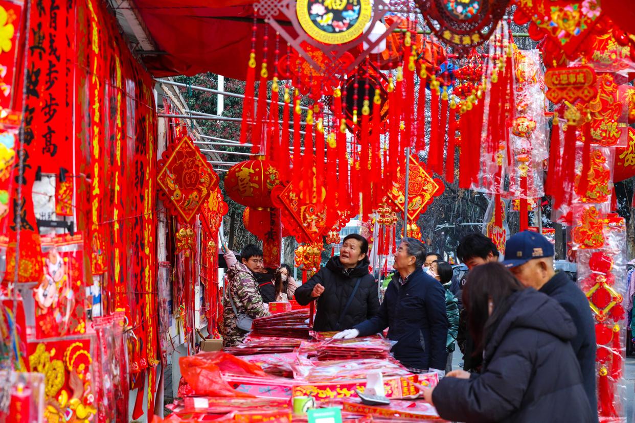 新春将至,年味渐浓。各地举办年货大集、写福字春联等活动,人们选购鲜花、中国结等饰物,迎接新春。