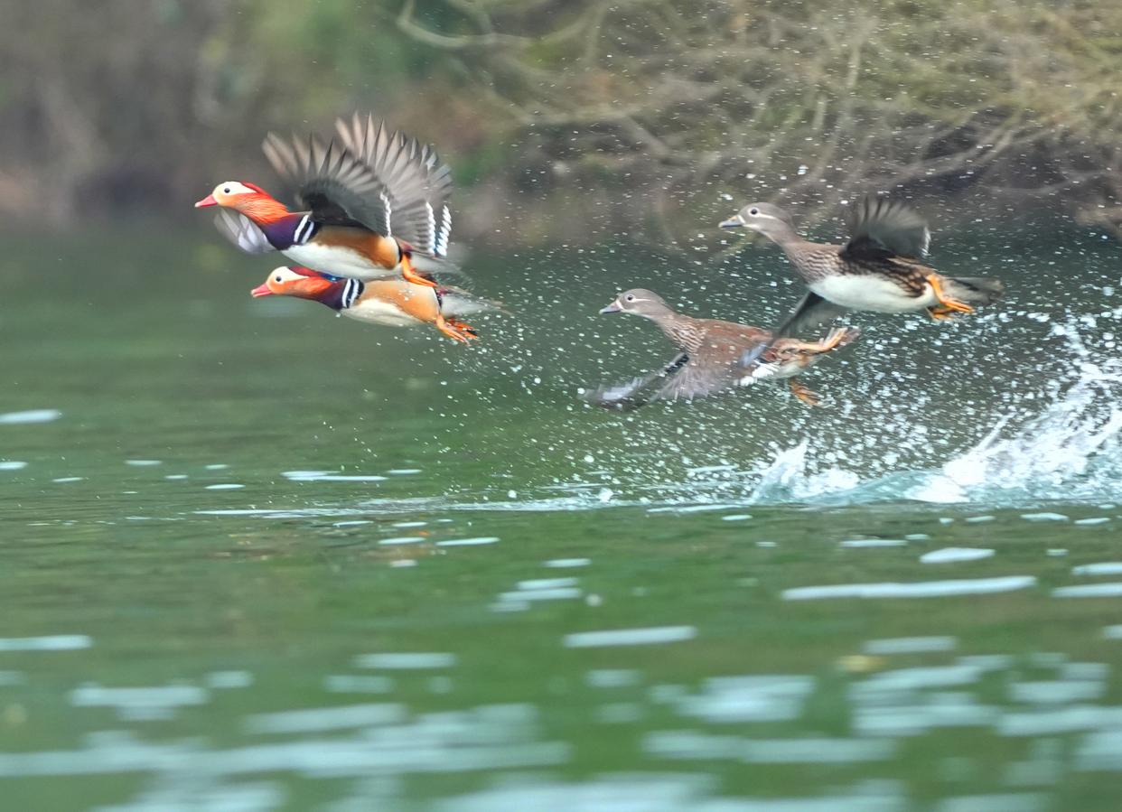 2月4日,鸳鸯在湖南省衡阳市衡东县杨林镇洣水河畔嬉戏。新华社发(曹正平摄)