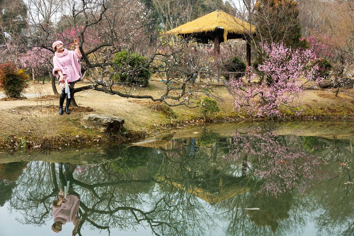 2月5日,游人在江苏省南京市梅花山景区赏花留影。新华社发(孙忠南摄)