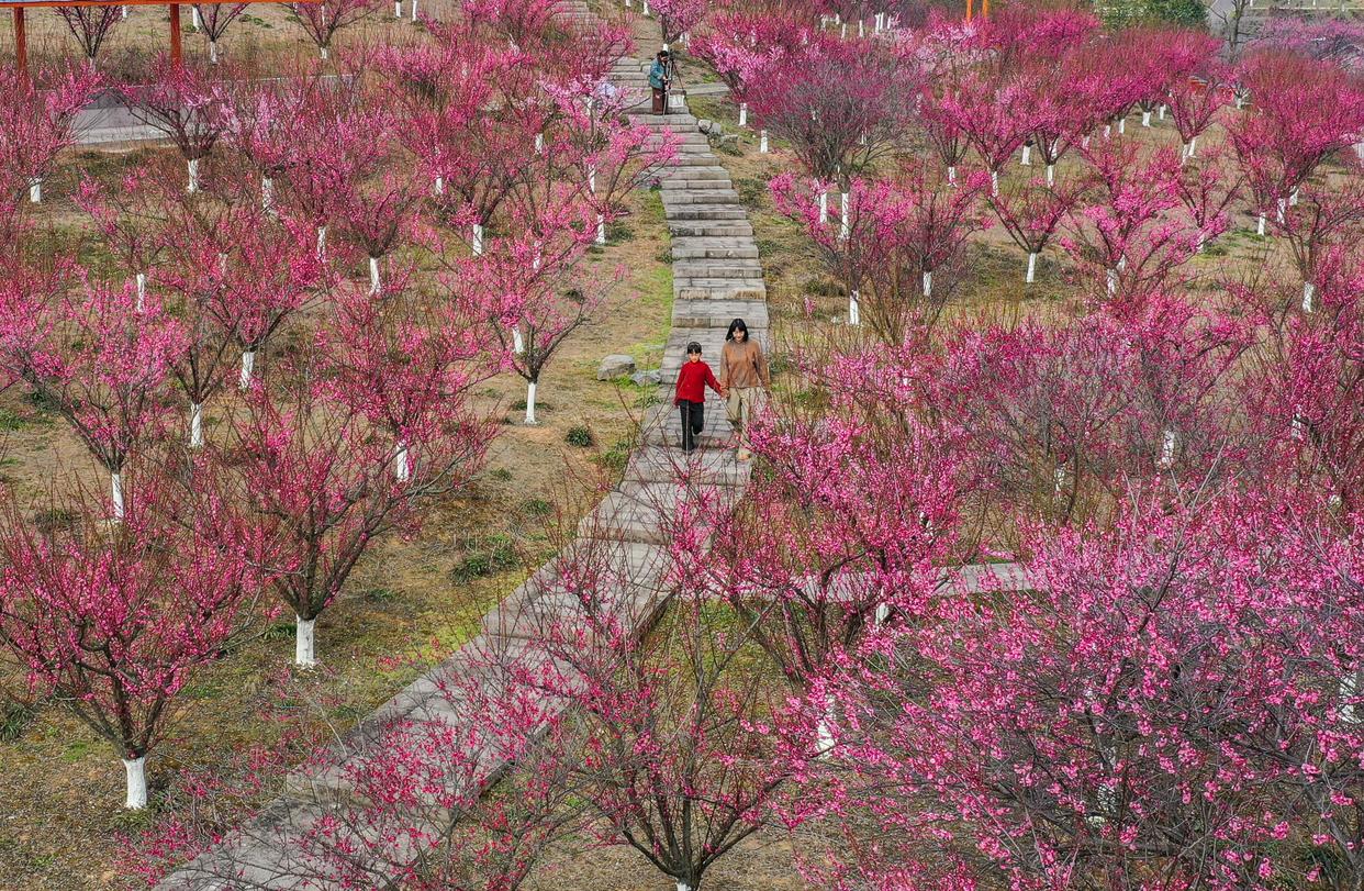 2月4日,游人在浙江省临海市古城梅园内赏梅游玩(无人机照片)。新华社发(王华斌摄)