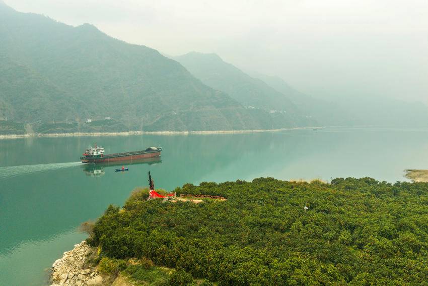 2月10日,船舶从湖北省秭归县沙镇溪镇范家坪村生态柑橘园外沿水域驶过。