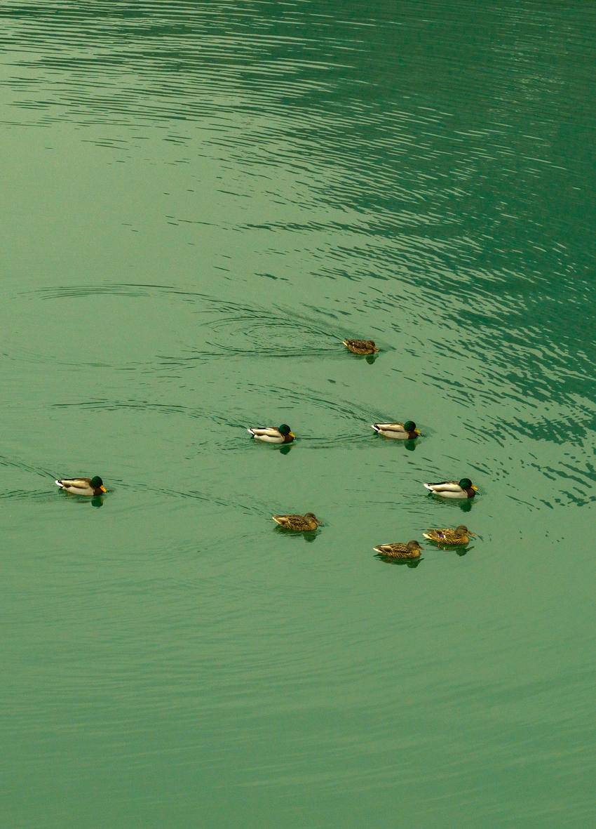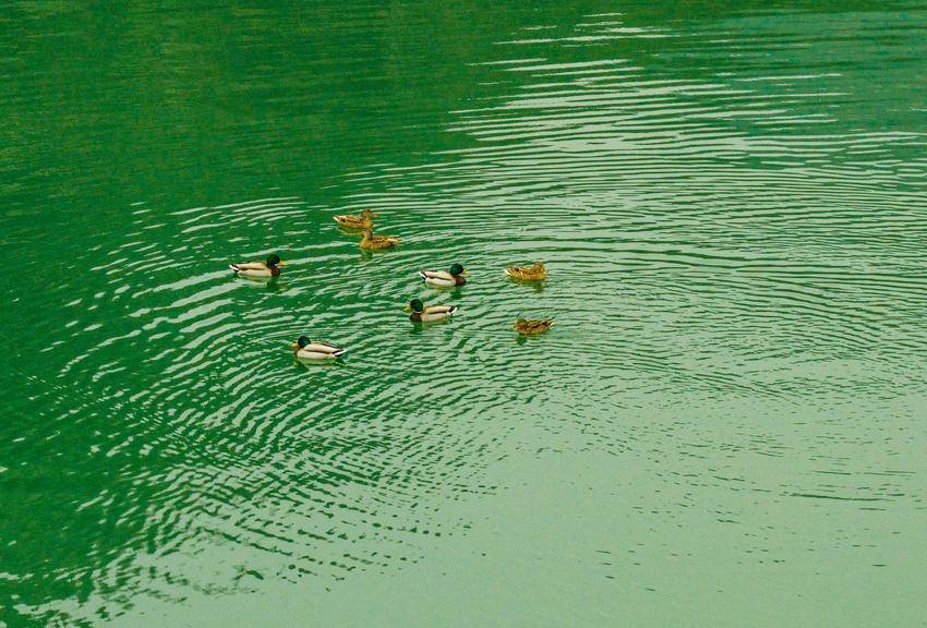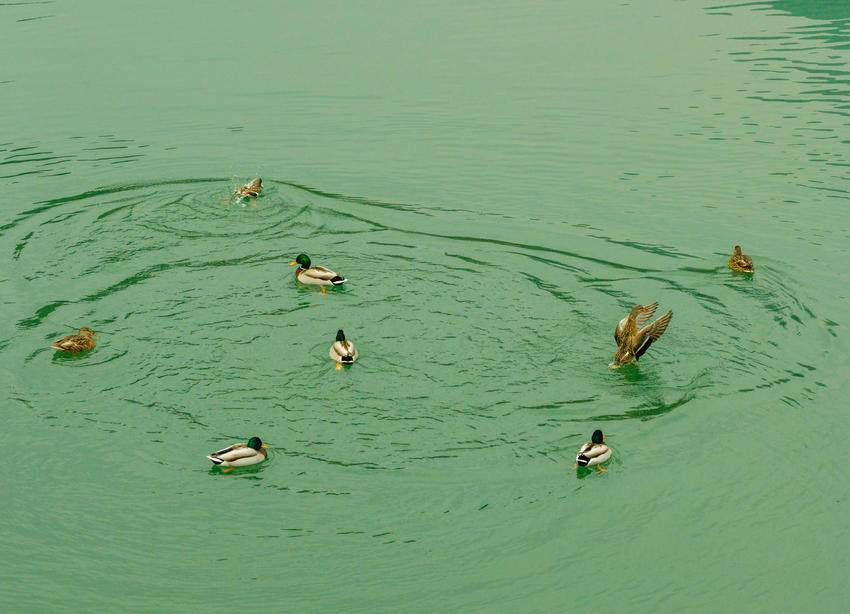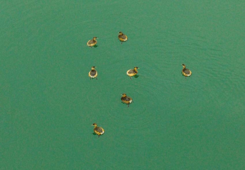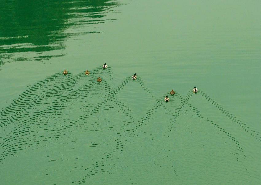 2月10日,水鸟在湖北省秭归县沙镇溪镇范家坪村外沿水域水面游弋嬉戏。