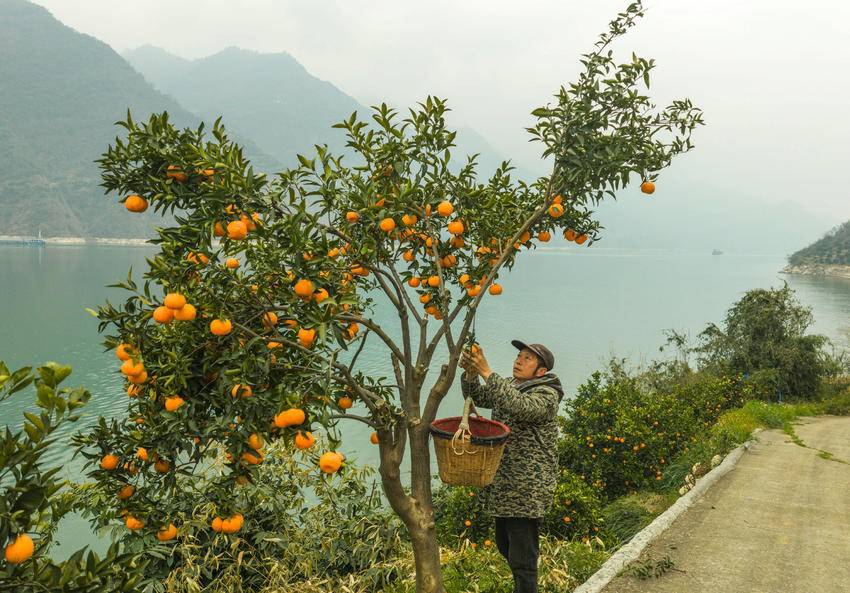 2月10日,湖北省秭归县沙镇溪镇范家坪村村民宋金龙在江边果园采摘柑橘。