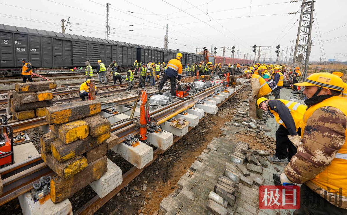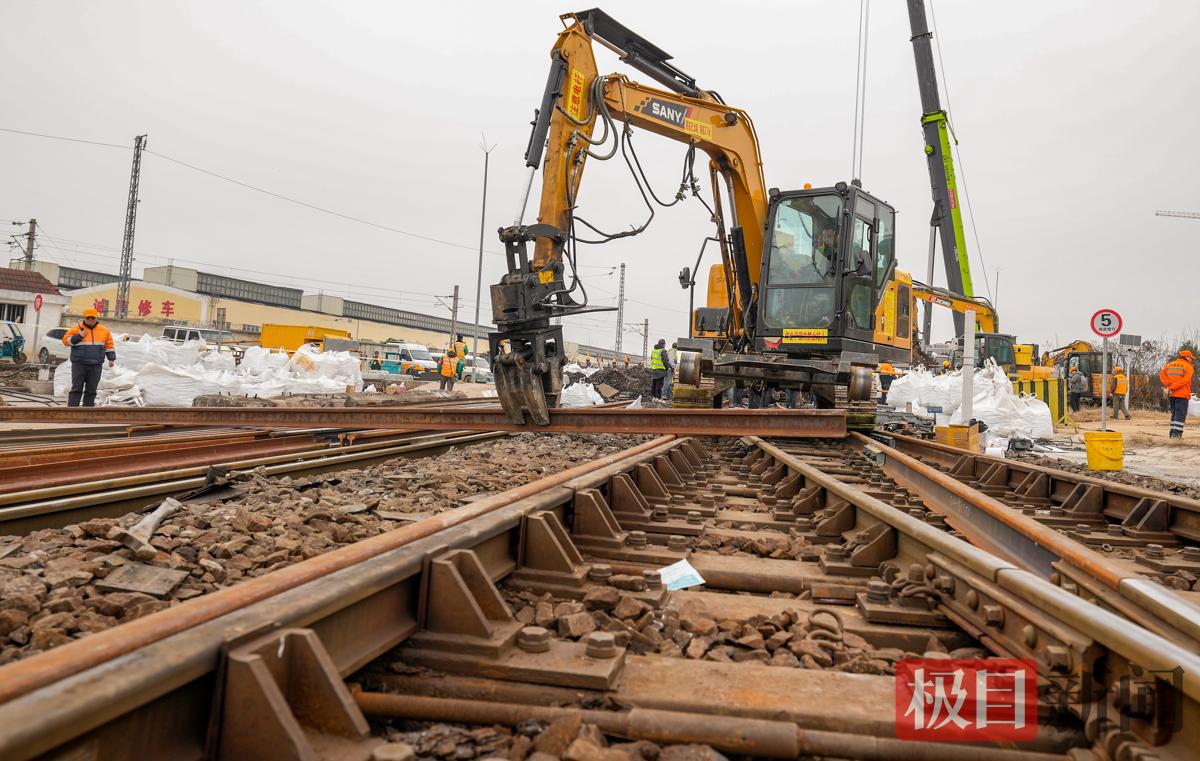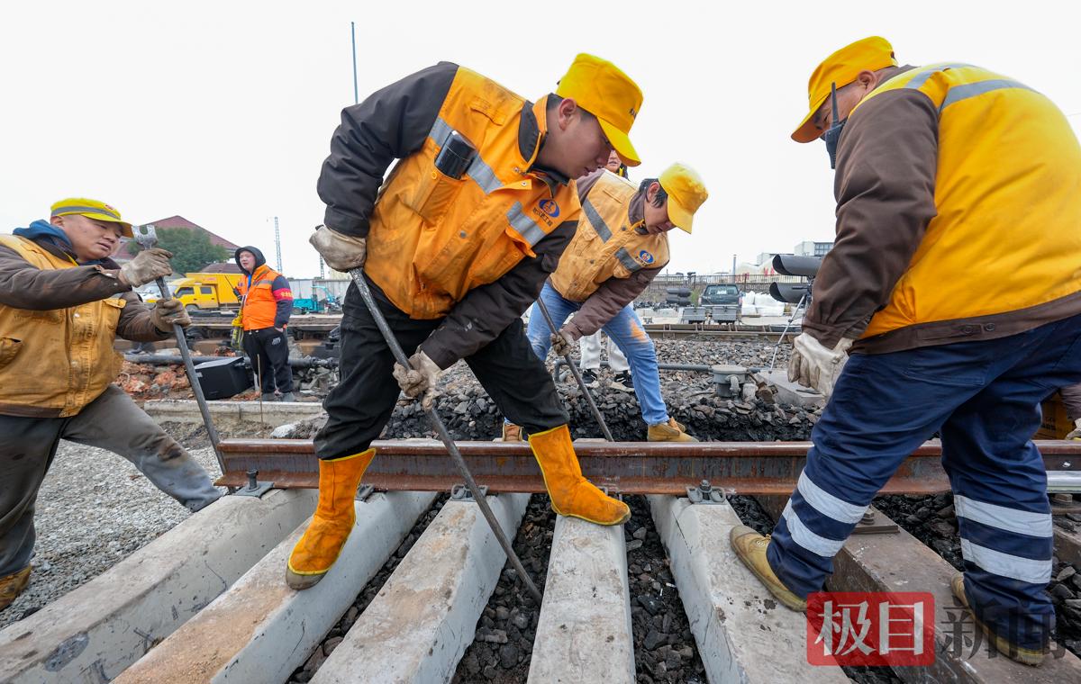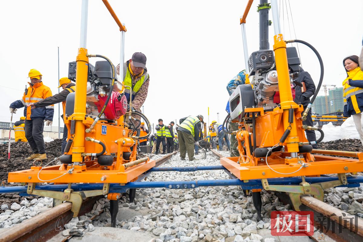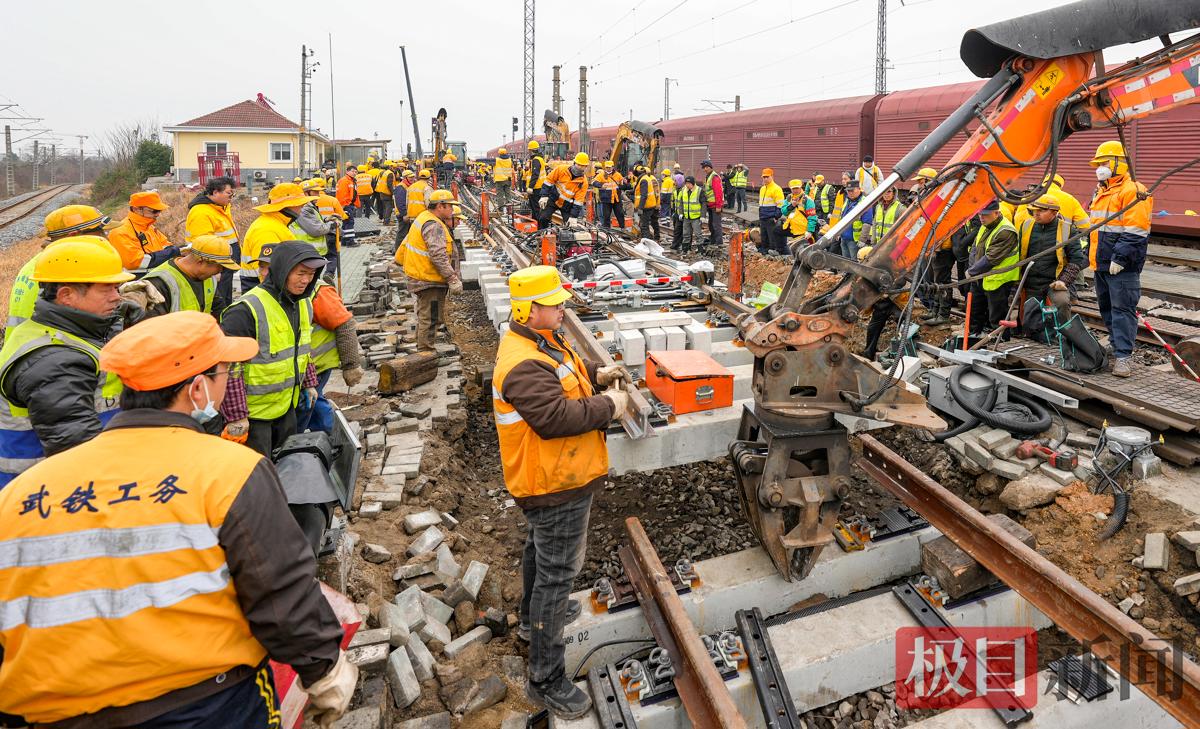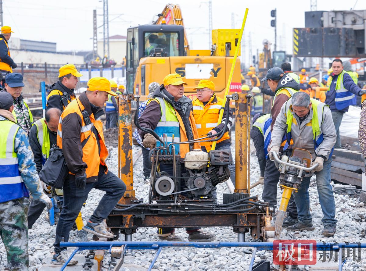 春节临近,春运正忙。2月12日早晨8时,地处武汉市黄陂区横店的中国中铁武汉局武汉北编组站二场内人头攒动,机械轰鸣。现场一辆300吨级的汽车吊正马不停蹄地来回吊装转运着道砟,轨道板等路料设备。吊机一侧,该局武汉桥工段200多名作业人员也在有序进行M1驼峰减速器的改造施工。