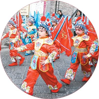 2月10日,山西省晋中市平遥县蓝天幼儿园的小朋友在平遥古城内表演传统戏曲。