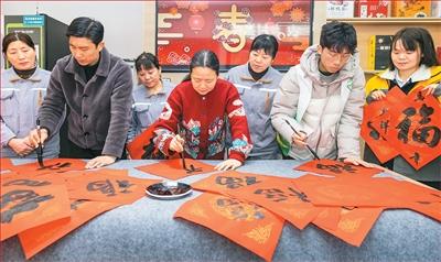 2月10日,书法爱好者在江苏省泰州市海陵区光明使者爱心驿站书写“福”字送给新就业形态劳动者。