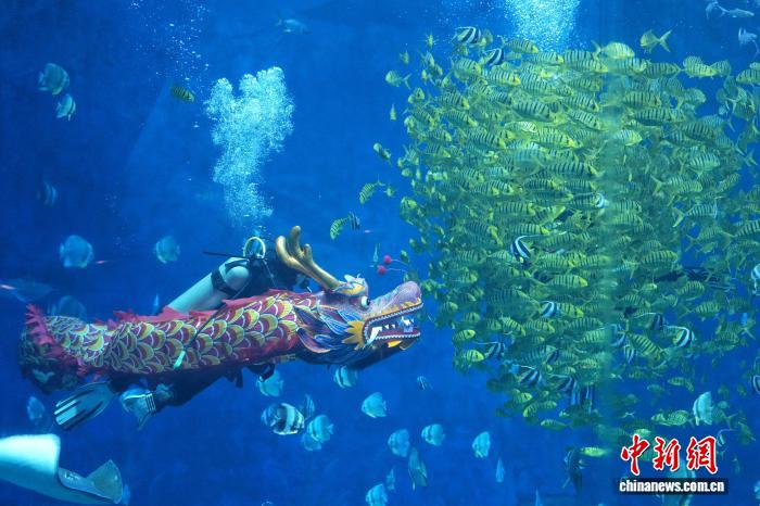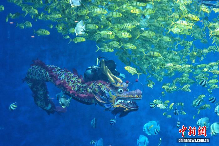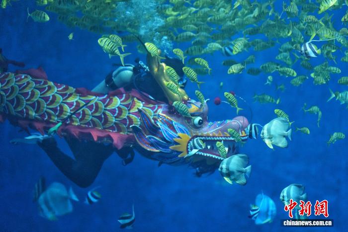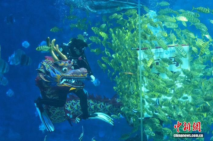 2月15日,长沙湘江海洋王国的潜水员手持新春标语、携龙头潜入水中与鱼群共舞,为游客带来沉浸式新春体验。图为潜水员在水下舞龙。 中新社记者杨华峰摄