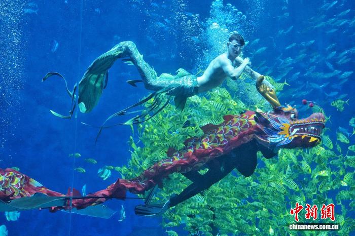 2月15日,长沙湘江海洋王国的潜水员手持新春标语、携龙头潜入水中与鱼群共舞,为游客带来沉浸式新春体验。图为美人鱼演员在水下与龙共舞。 中新社记者杨华峰摄