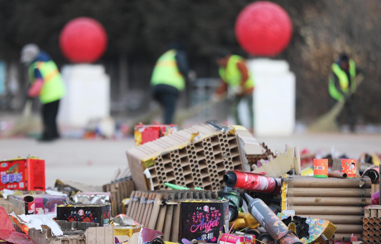 2月17日,黑龙江省齐齐哈尔市建华区环卫绿化服务中心职工在烟花爆竹燃放点清理燃放后的残余碎屑。新华社发(宋燕军摄)