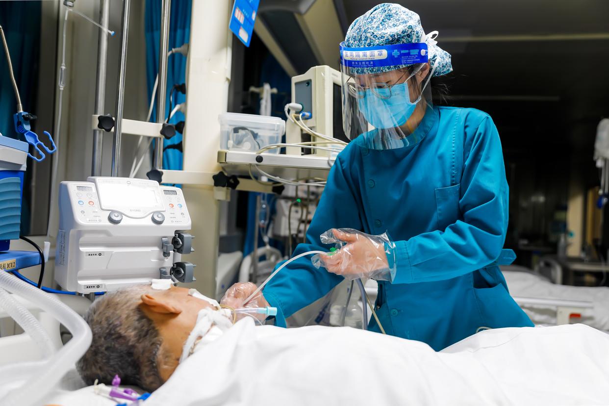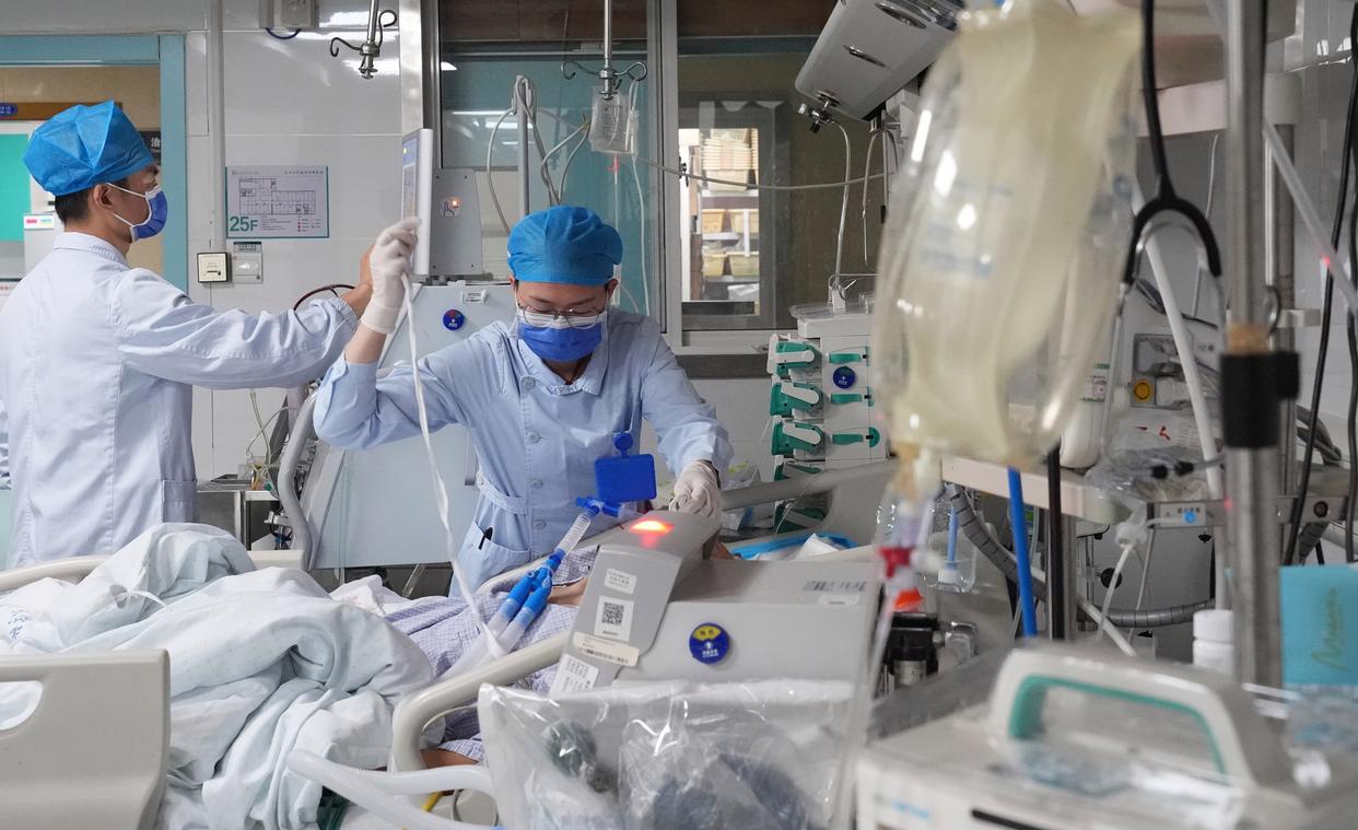 2月17日,在湖南省衡阳市南华大学附属第一医院ICU,医务工作者对患者进行医治。 新华社发(曹正平摄)