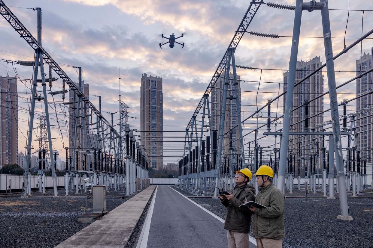2月17日,国网泰州供电公司运维人员在220千伏寺巷变电站利用无人机巡检电力设备。新华社发(汤德宏摄)