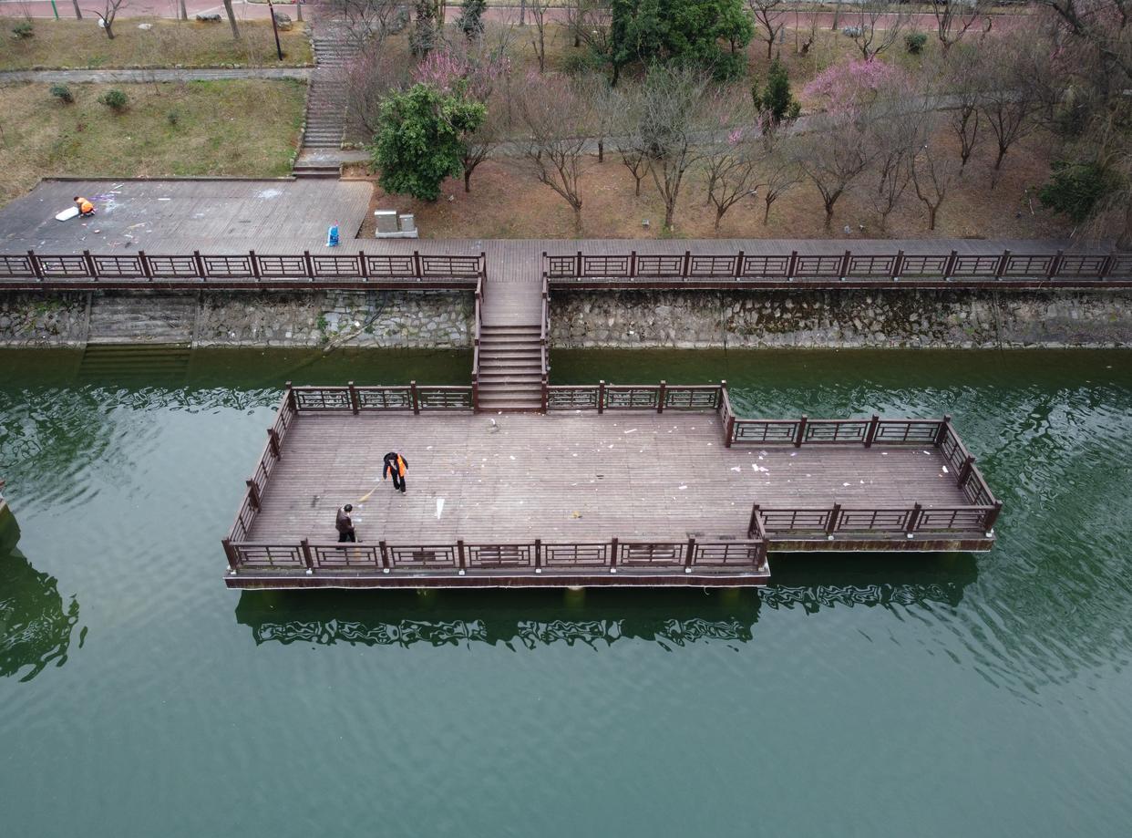 2月17日,环卫工人在贵州省黔东南苗族侗族自治州施秉县河滨公园清扫保洁(无人机照片)。新华社发(邰胜智摄)