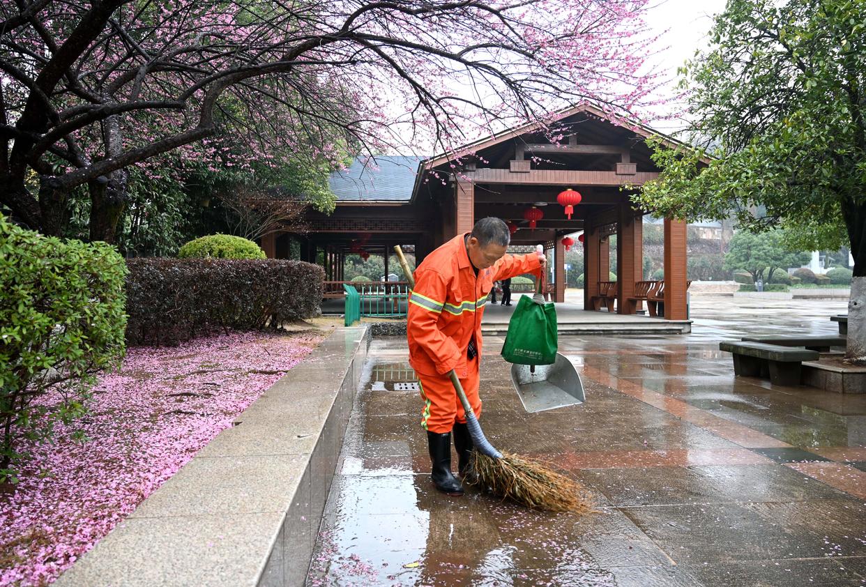 2月17日,浙江省金华市武义县环卫工人在梅郎山公园清扫垃圾。新华社发(张建成摄)