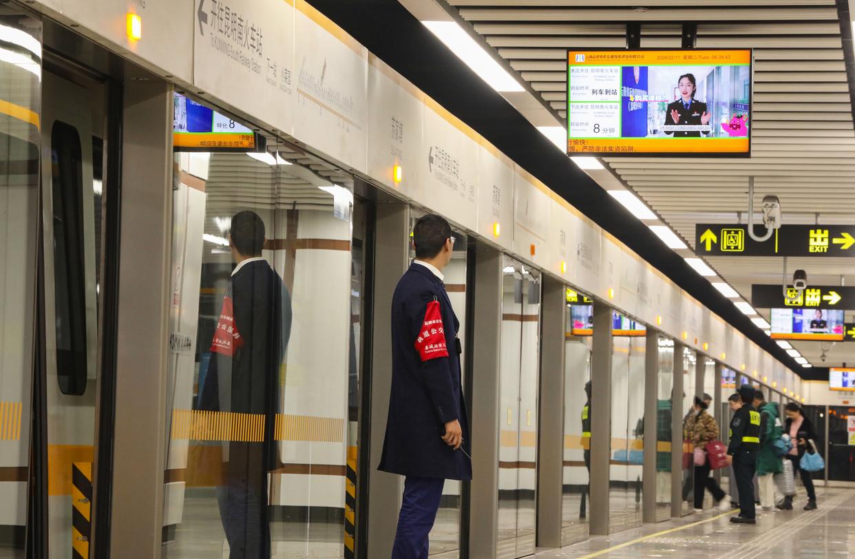 2月17日,在云南昆明地铁4号线苏家塘站,站务人员在观察旅客乘降情况。新华社发(郑益摄)