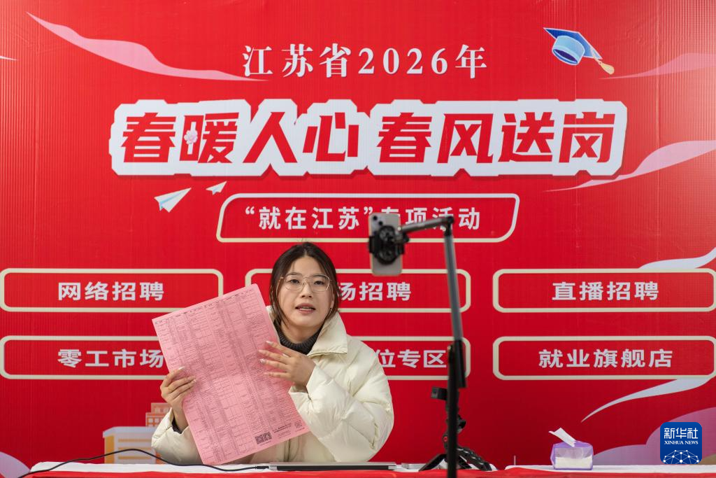 2月24日,在江苏省泰州市海陵区举办的2026年“春风送岗 就在海陵”专场招聘会上,工作人员利用直播平台推荐岗位信息。