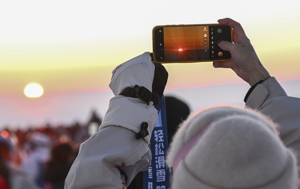 2月25日,滑雪爱好者在新疆阿勒泰将军山国际滑雪度假区拍摄夕阳。新华社记者 王菲 摄