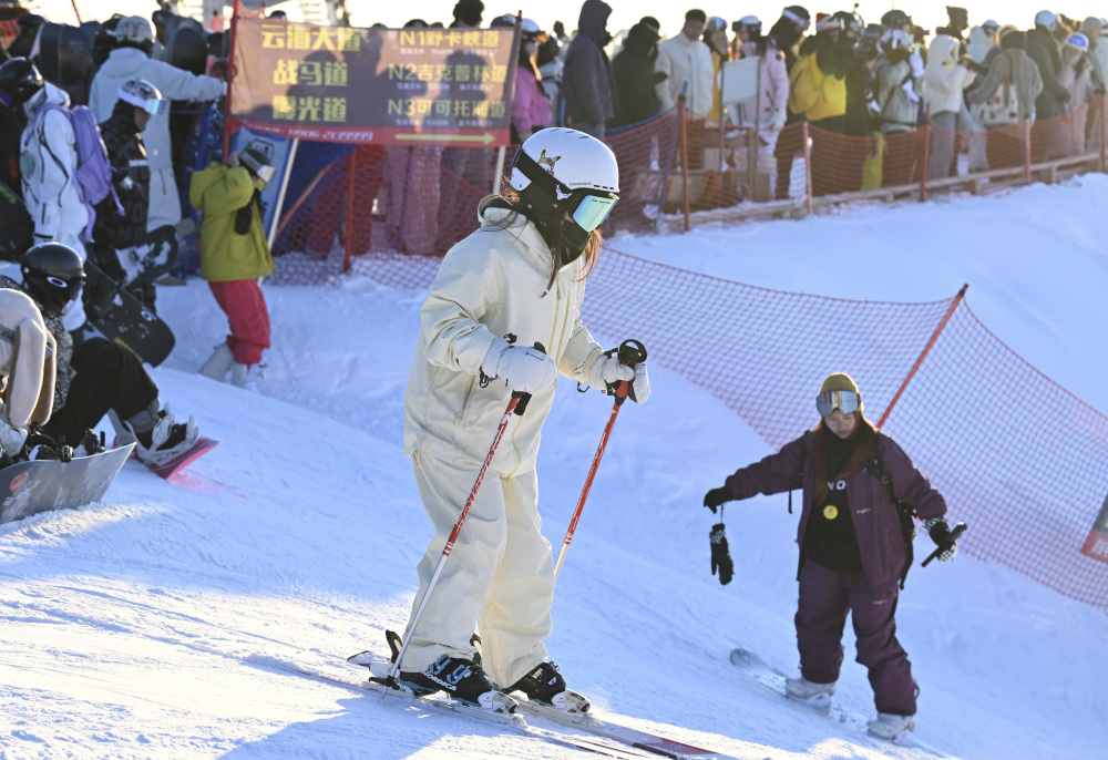 2月25日,滑雪爱好者在新疆阿勒泰将军山国际滑雪度假区参加“夕阳派对”。新华社记者 王菲 摄