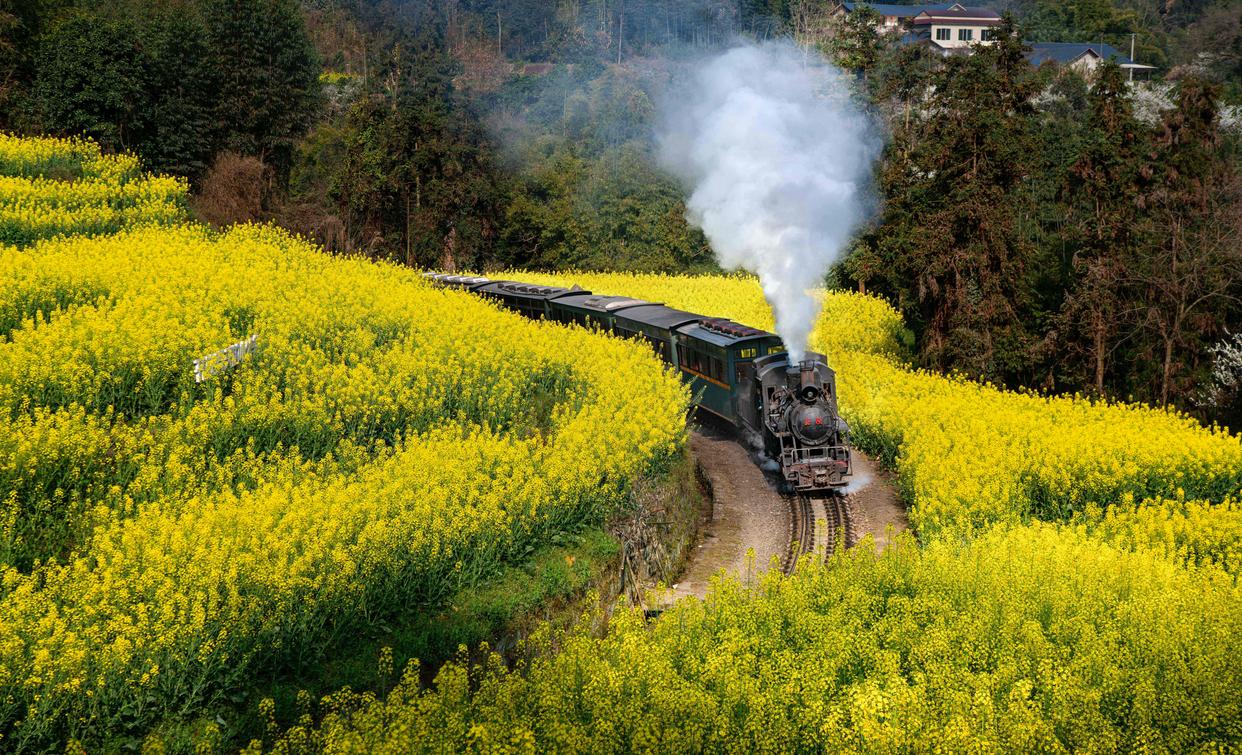 2月26日,四川省乐山市犍为县,小火车在油菜花海中穿行。新华社发(孔胜摄)
