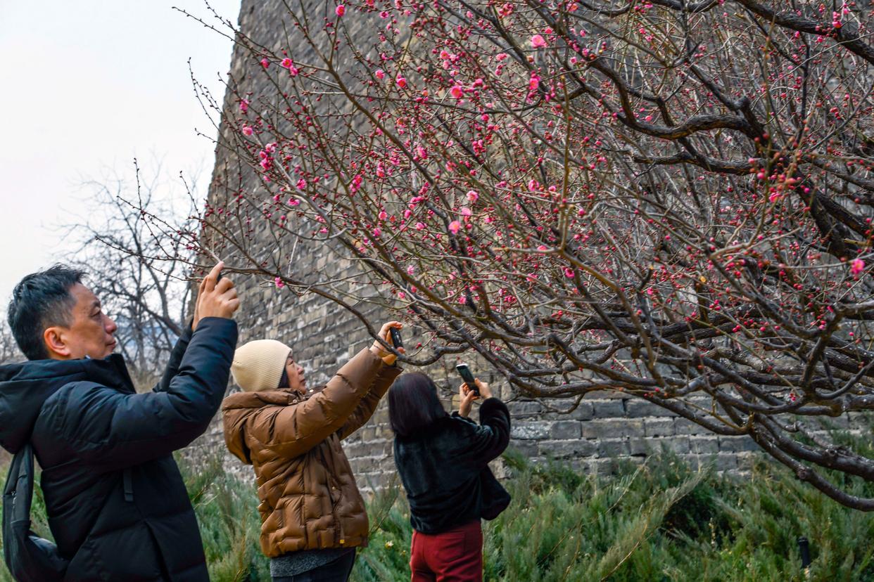 2月26日,游客在北京市明城墙遗址公园赏花拍照。新华社发(刘满仓摄)