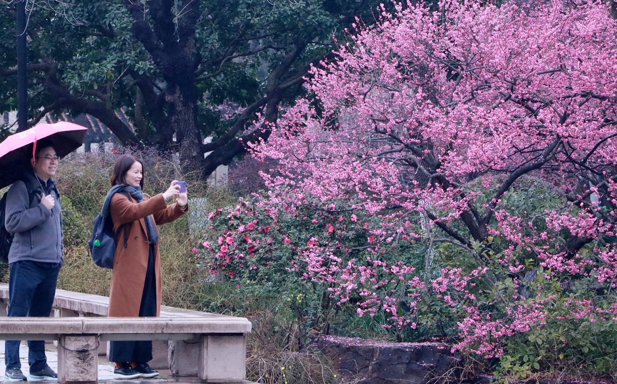 2月27日,游客在江苏常州红梅公园雨中赏梅。新华社发(王启明摄)