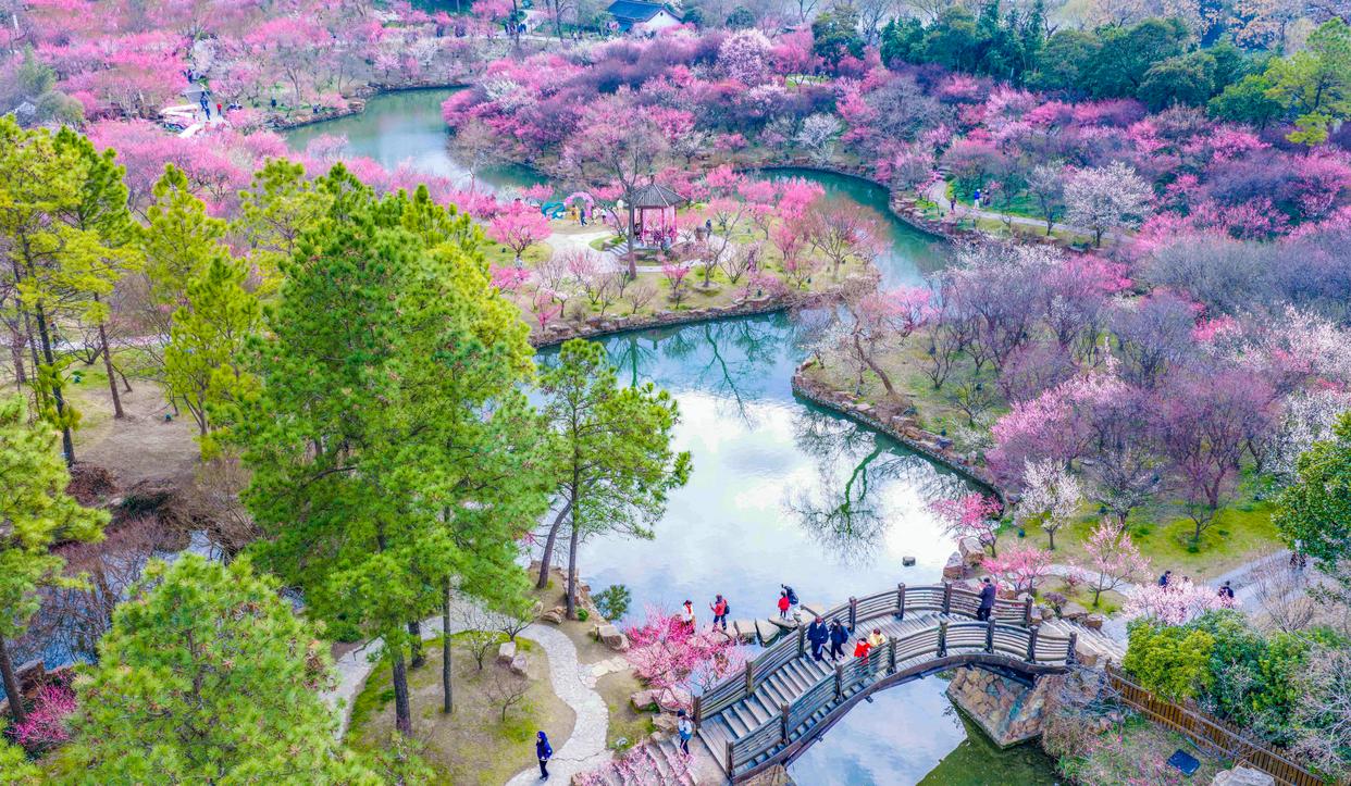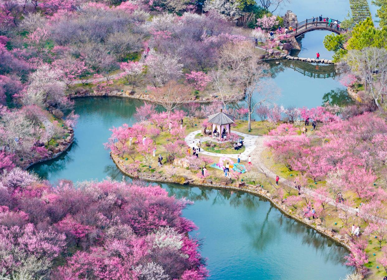 2月25日,游客在江苏扬州瘦西湖风景区赏梅游玩(无人机照片)。新华社发(周社根摄)