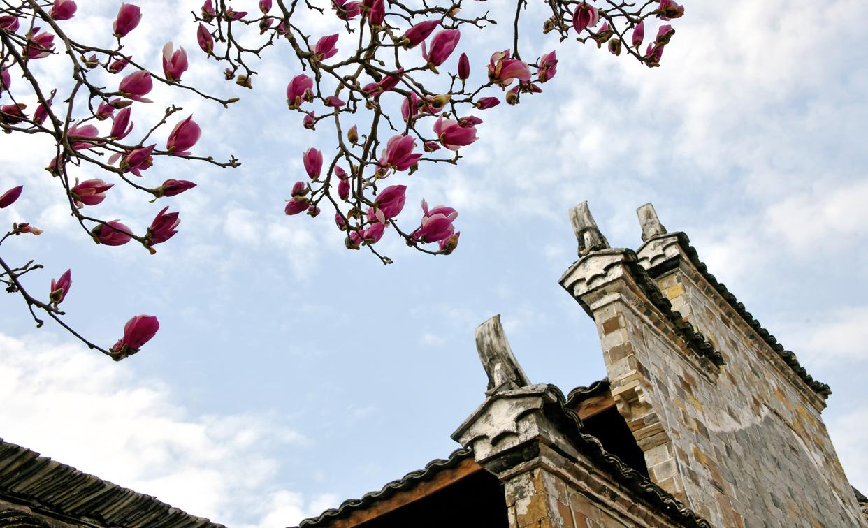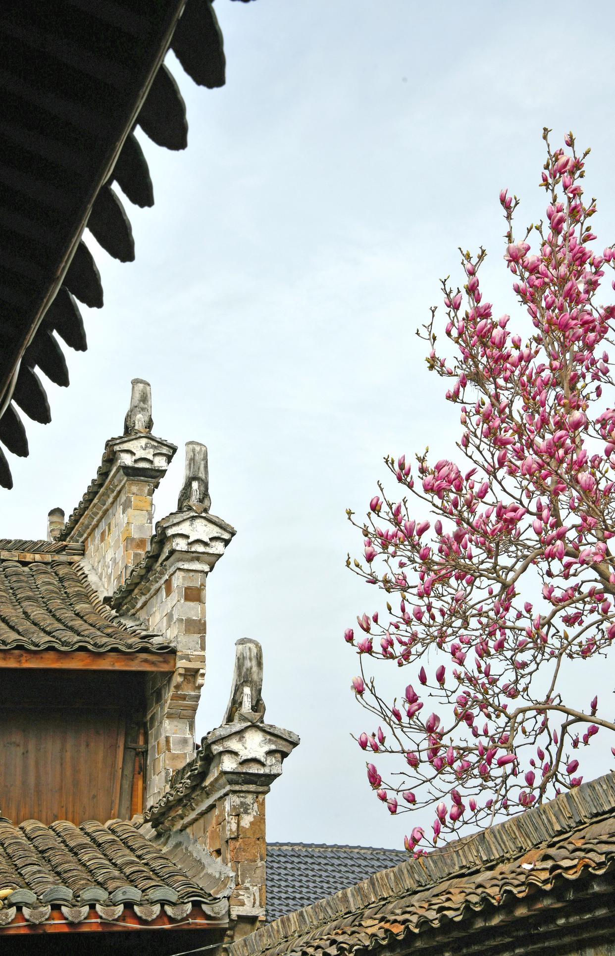 2月26日在浙江省台州市仙居县埠头镇西亚村拍摄的玉兰花和民居。新华社发(王华斌摄)