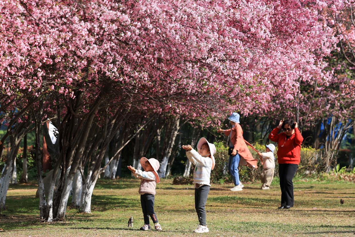 2月26日,游客在云南省曲靖市沾益区玉林广场海棠花树下赏景游玩。新华社发(孙文来摄)