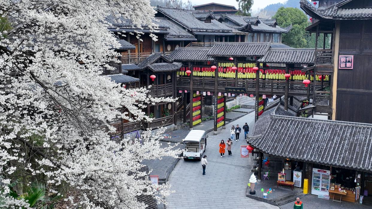 2月25日,游客在重庆市酉阳土家族苗族自治县酉州古城景区赏花游玩(无人机照片)。新华社发(邱洪斌摄)