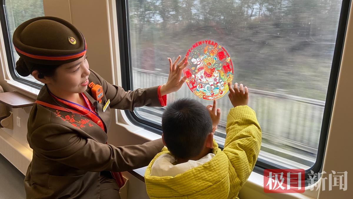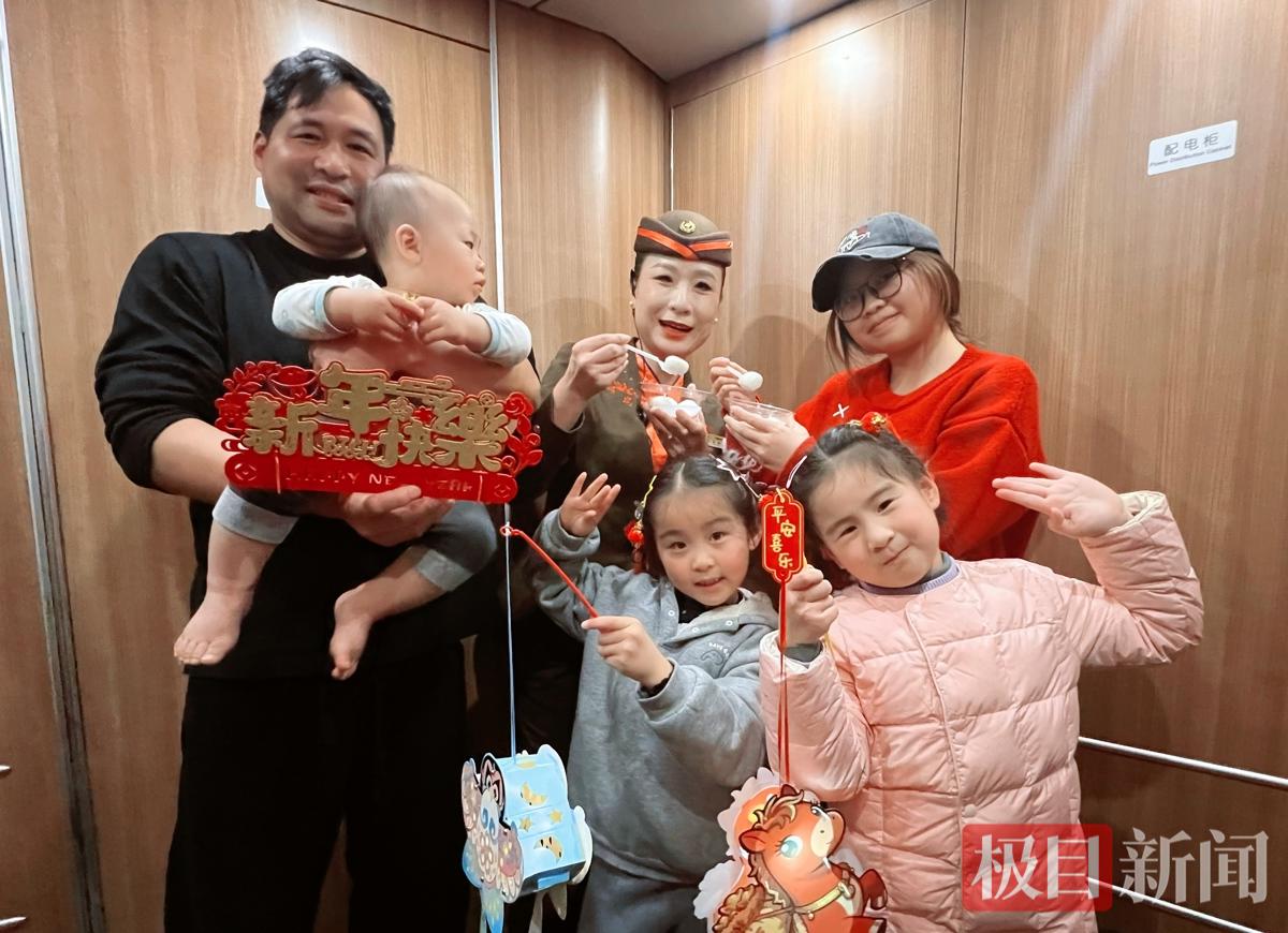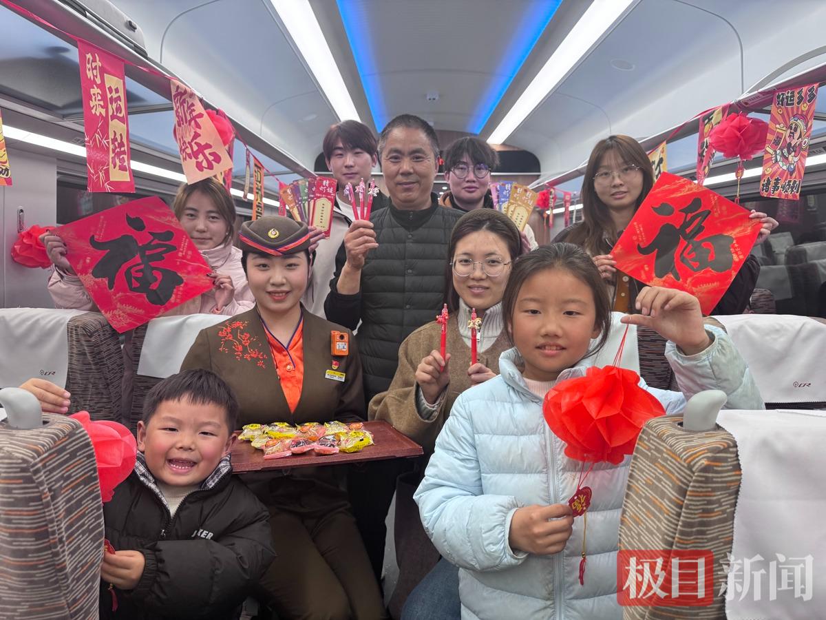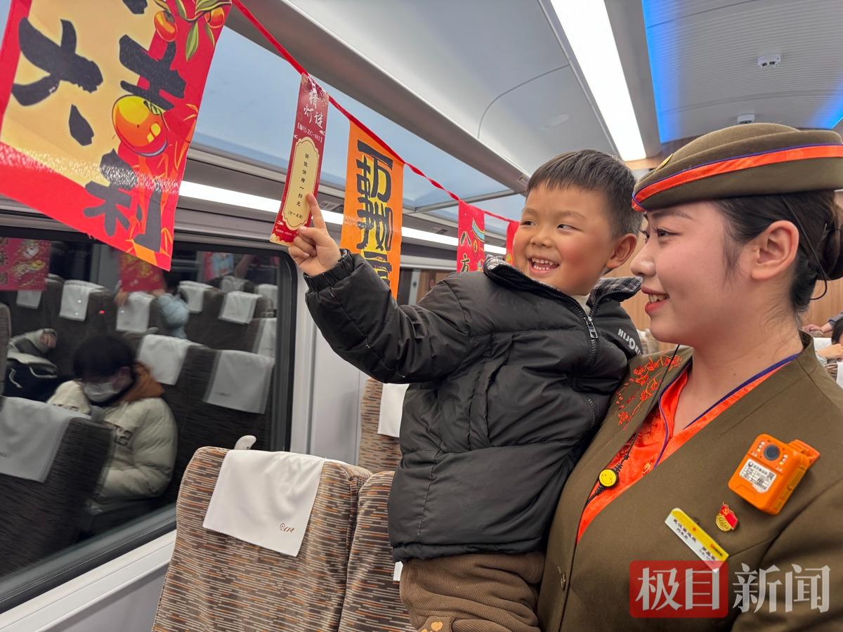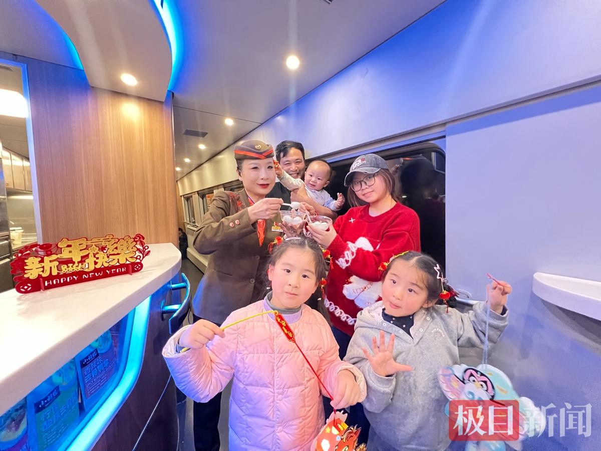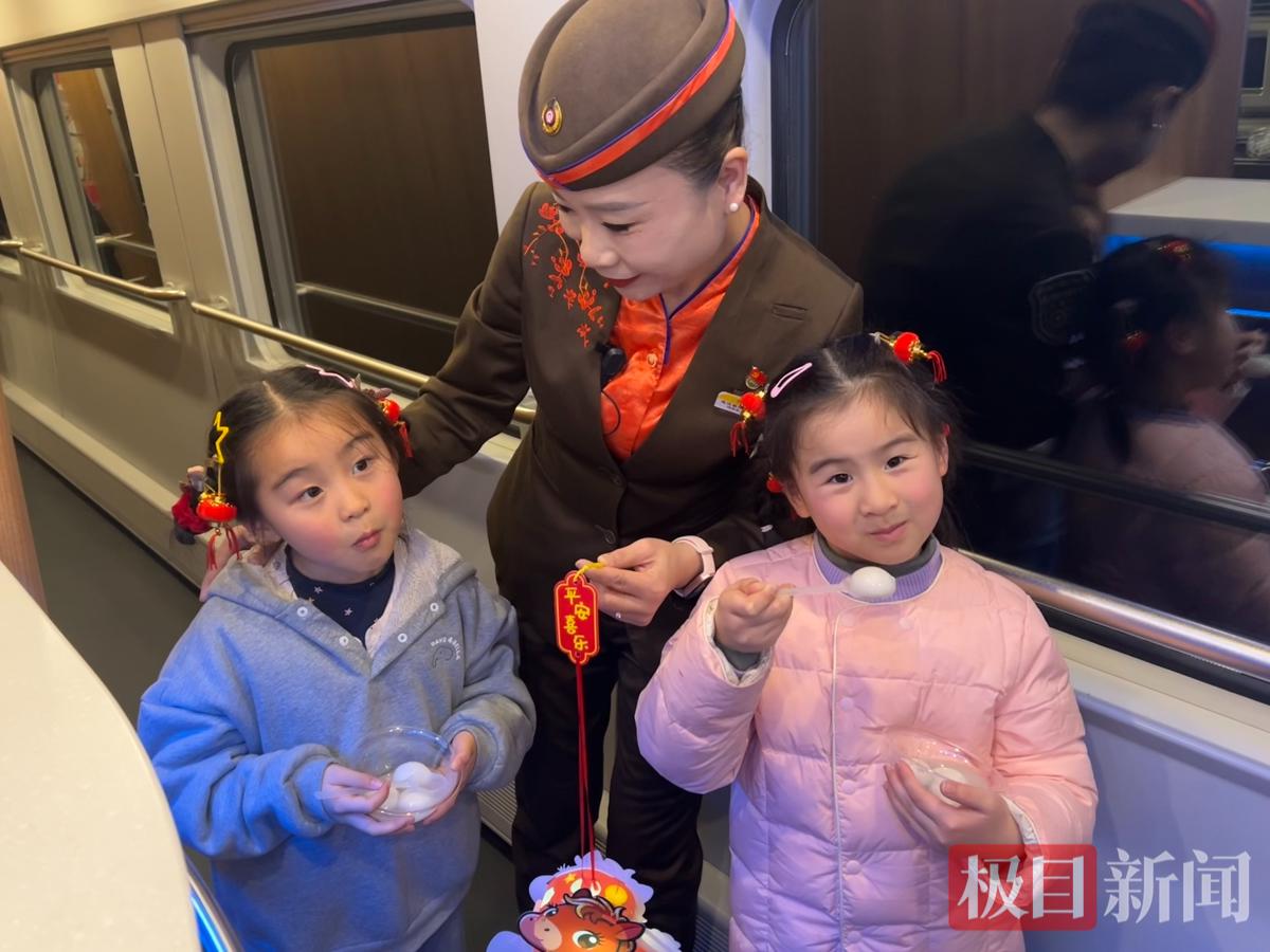 乘务人员装扮车厢打造“移动灯会”,通过猜灯谜互动,为猜对的旅客送上马年限定纪念笔,小旅客现场献唱点燃氛围。同时,列车员为旅客送上热汤圆和马年花灯,发放福袋,传递温情。