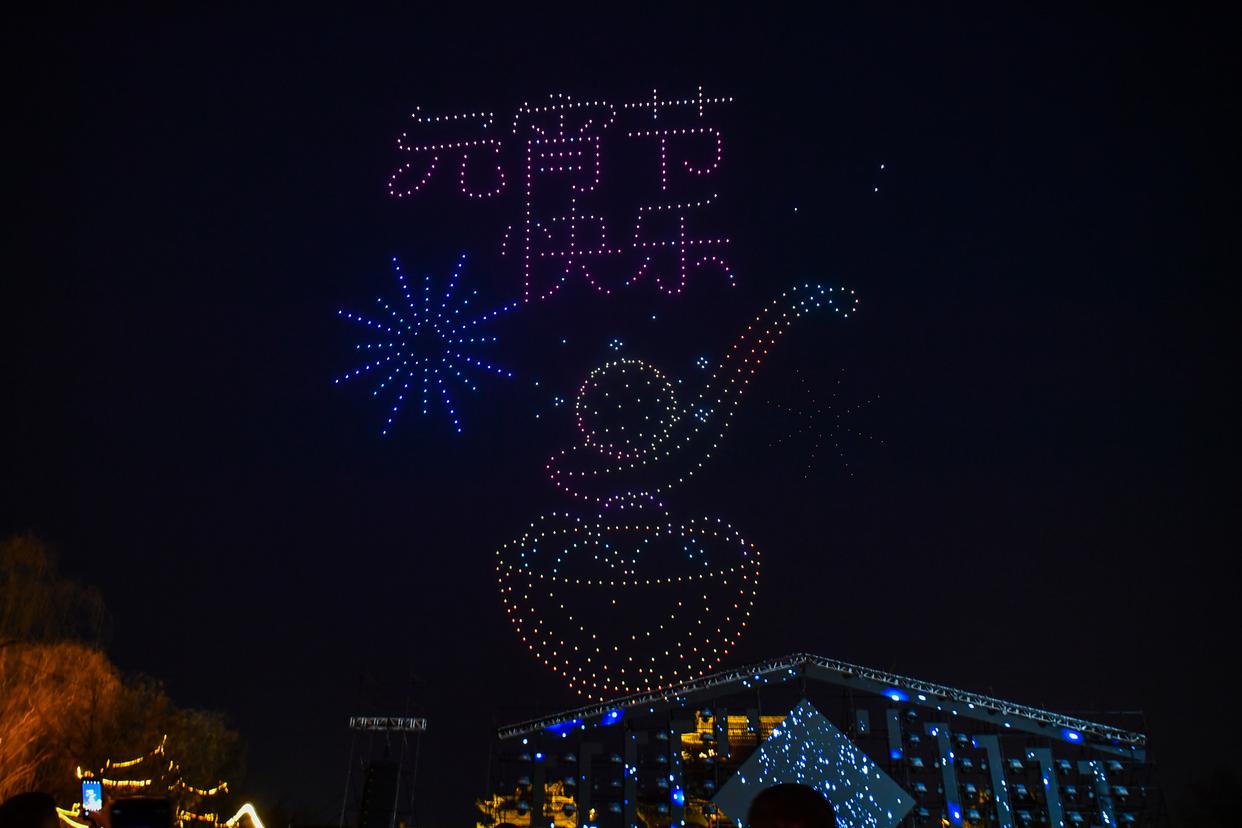 这是3月2日在山西省晋中市榆次老城拍摄的无人机表演。新华社记者 曹阳 摄