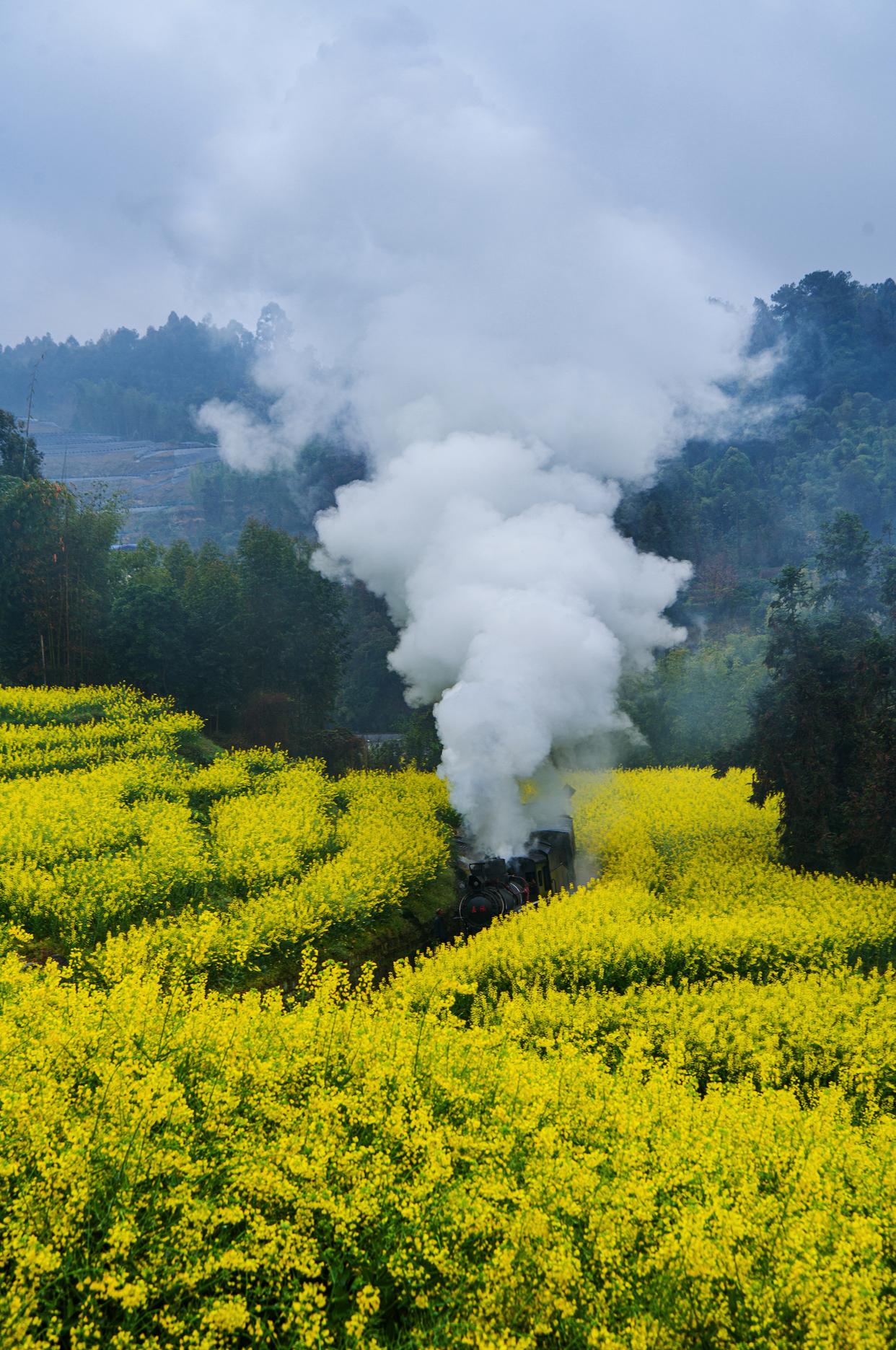 3月1日,在四川省乐山市犍为县,小火车在油菜花海中穿行。新华社发(孔胜摄)