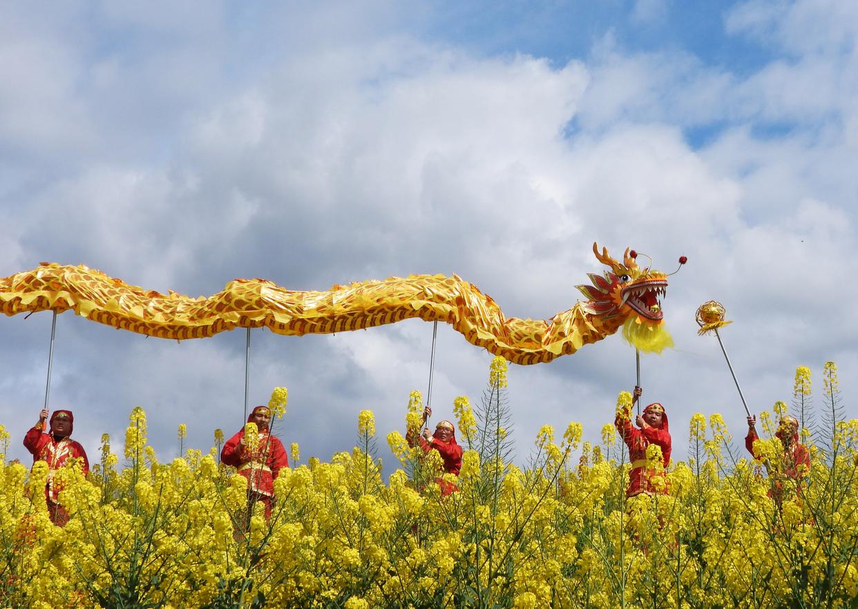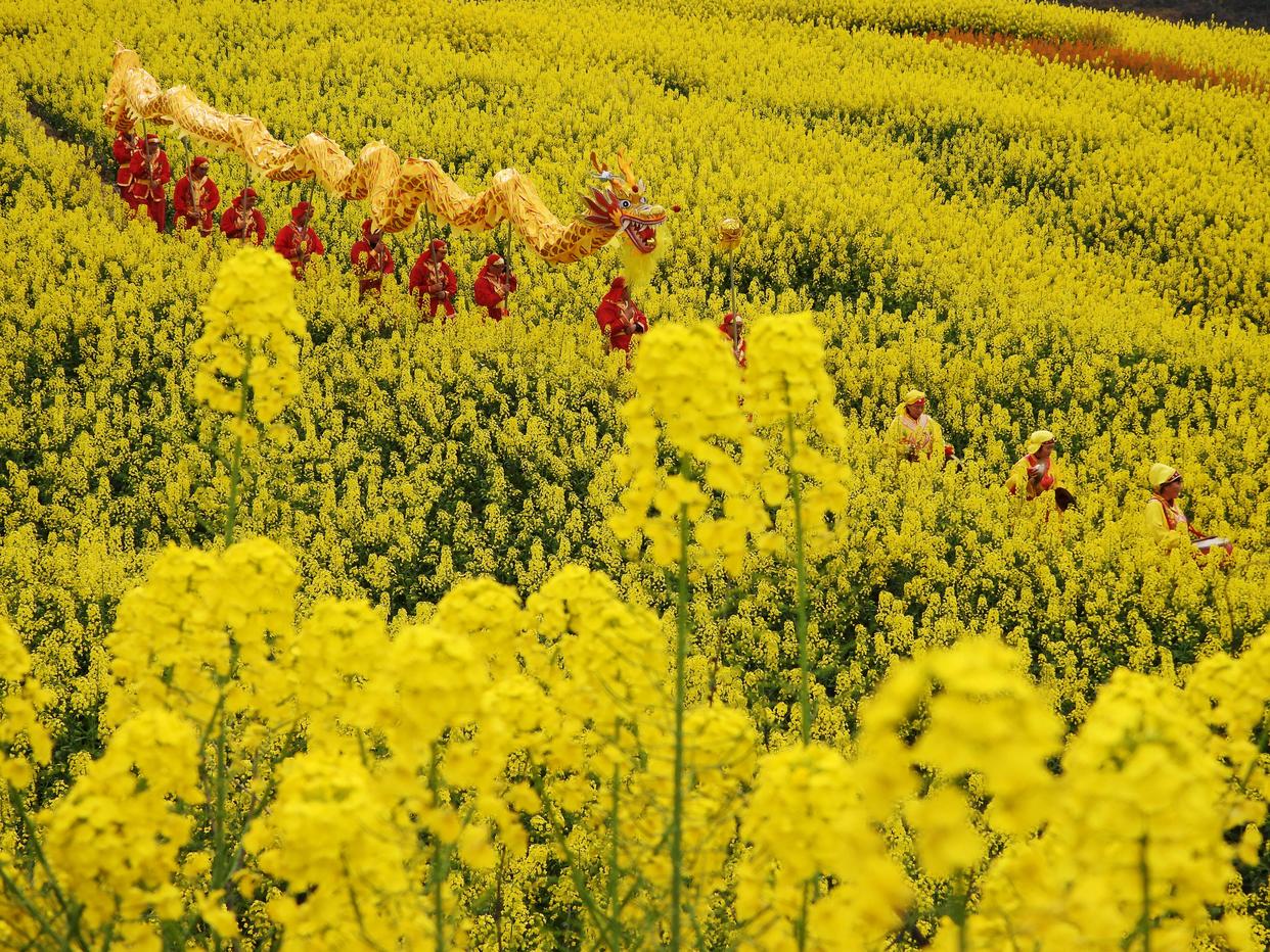 3月2日,人们在四川省达州市达川区龙会乡的油菜花田间表演舞龙。新华社发(邓良奎摄)