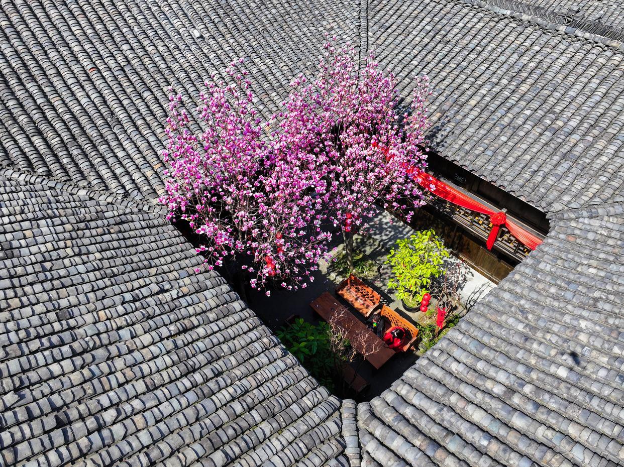 2月27日,人们在四川省阆中市阆中古城盛开的玉兰花下小憩(无人机照片)。新华社发(王玉贵摄)