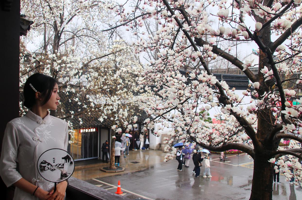 3月1日,游客在玉兰绽放的江苏省苏州市狮子林赏花游玩。新华社发(王建康摄)