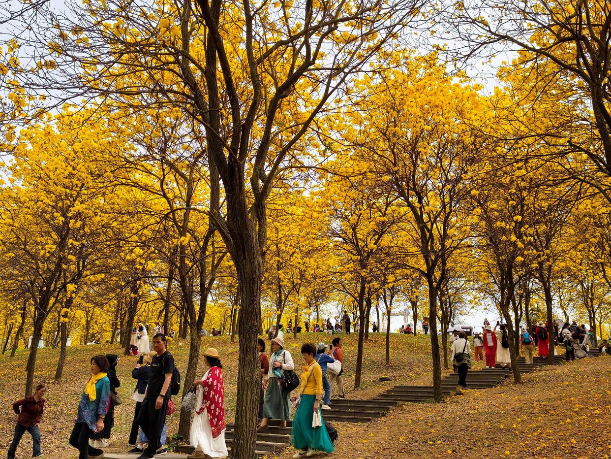 3月2日,人们在广西南宁市青秀山风景区观赏黄花风铃木。新华社发(喻湘泉摄)