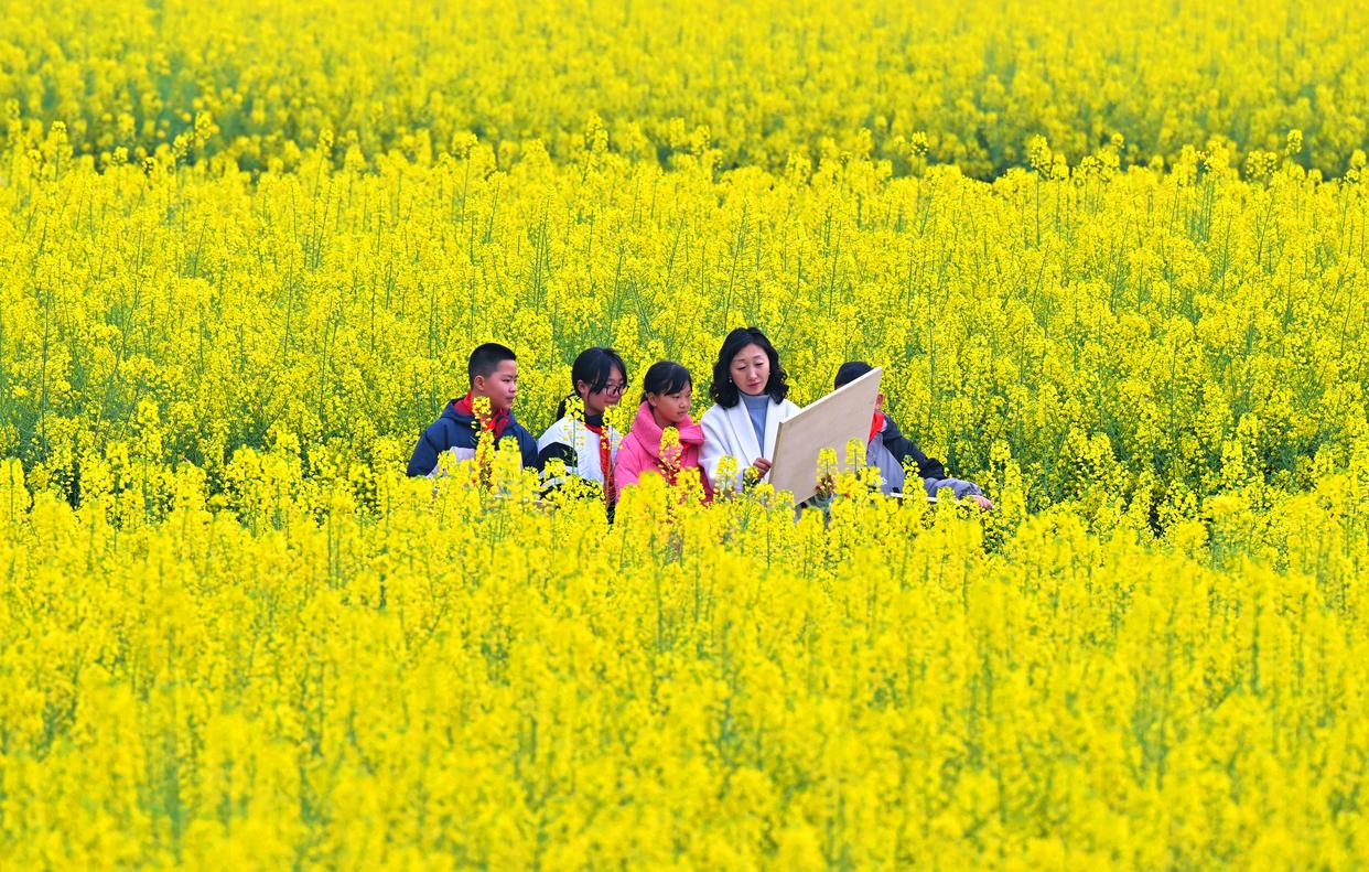 3月2日,学生在四川省眉山市仁寿县珠嘉镇油菜花田写生。新华社发(潘建勇摄)