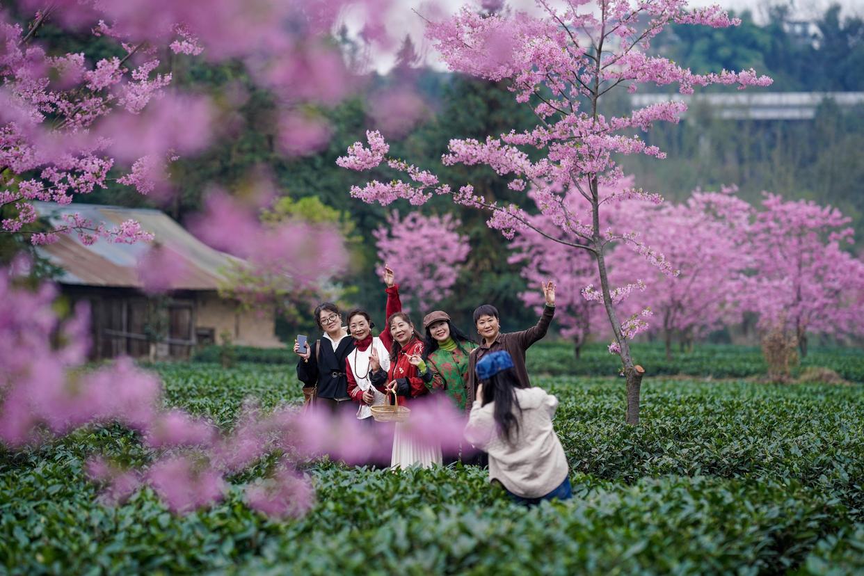 2月27日,四川省雅安市名山区新店镇茶园樱花迎来盛花期,吸引人们前来踏青赏花。新华社发(翁光建摄)