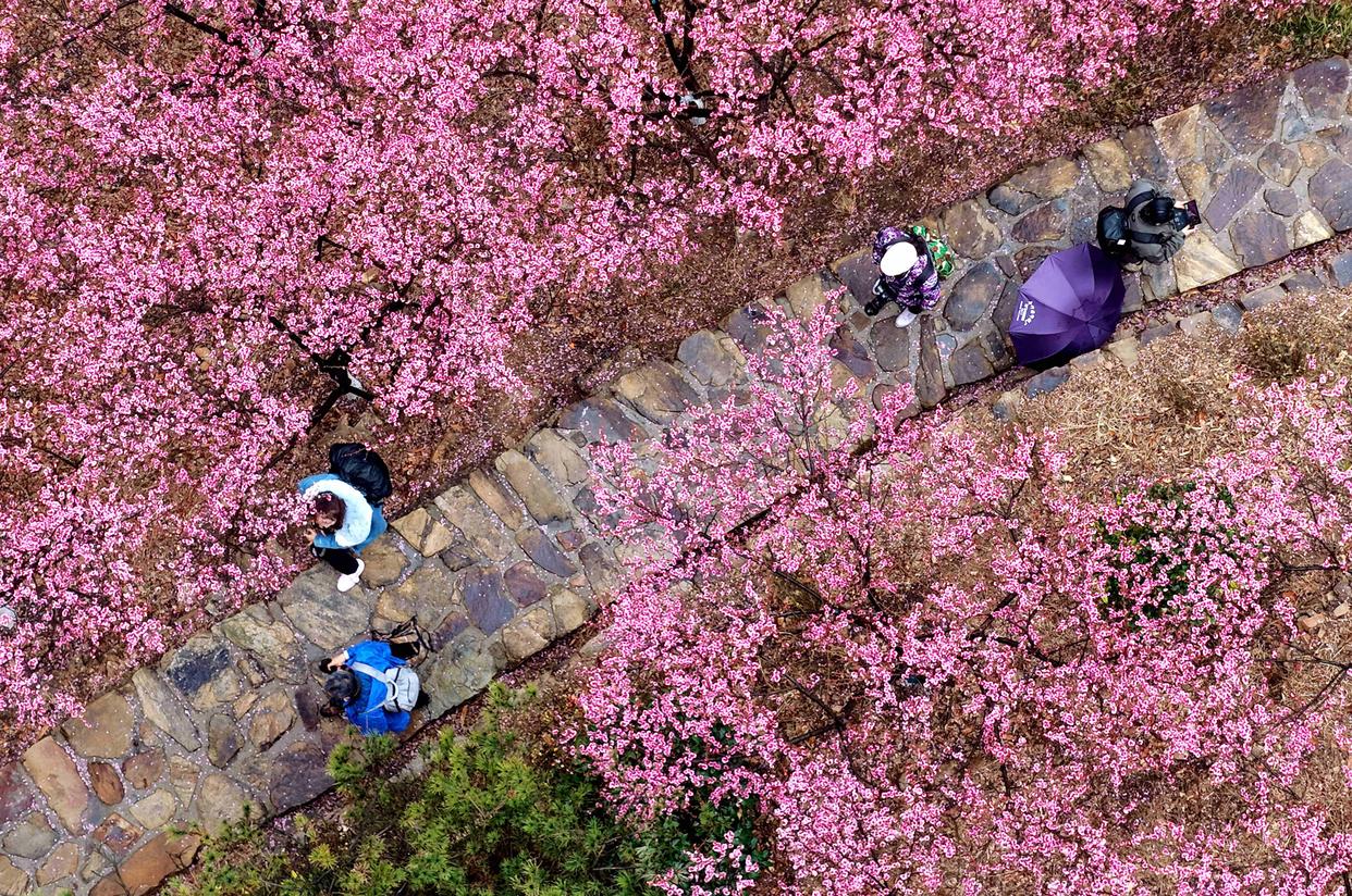 3月1日,游客在江苏省连云港市花果山景区梅园观赏盛开的梅花(无人机照片)。新华社发(王春摄)