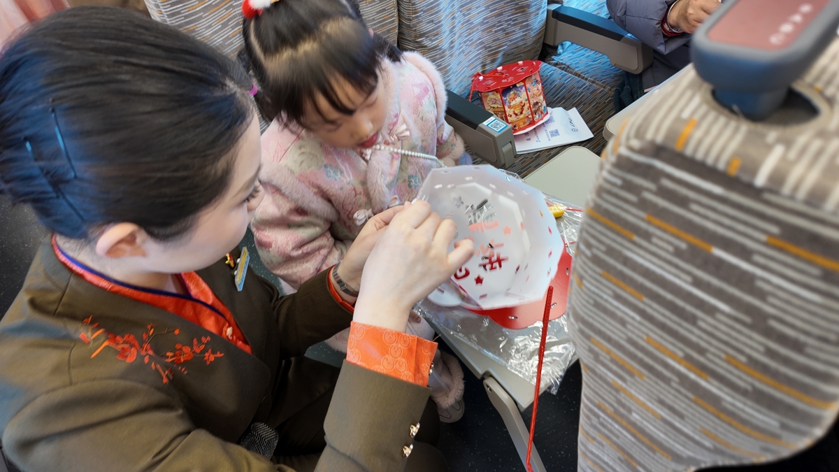 活动中,“灯谜喜乐会”、“巧手闹元宵”等趣味环节轮番登场。乘务组精心准备了多条灯谜,涵盖民俗、成语、生活常识等内容,旅客们踊跃参与猜谜,答对的旅客还收获了精致的元宵小礼品;乘务员还拿出彩纸、灯笼等材料,带领小朋友和旅客们一起手工制作元宵灯笼,小巧精致的灯笼挂满车厢,增添了浓浓节日气息。
