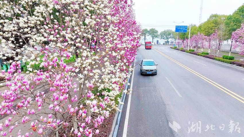 在宜都市陆城长江大道东段,道路两侧的玉兰花竞相绽放,素净如云的白玉兰与淡雅芬芳的紫玉兰相映成景,花朵硕大饱满、缀满枝头,在春风中摇曳生姿。阵阵花香扑面而来,沁人心脾,将街道装扮得春意盎然。不少市民被这迷人的春色吸引,纷纷放慢脚步、驻足观赏。