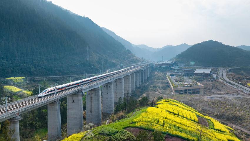 走进平阳坝,就像走进了一幅画。最吸引人的,是动车从花海和田间穿过的场景。高铁线路外的环形公路里,油菜花田像一块巨大的金色地毯铺展开来,各种颜色的动车组疾驰而过,像极了流动的花海,满眼都是春的景色。