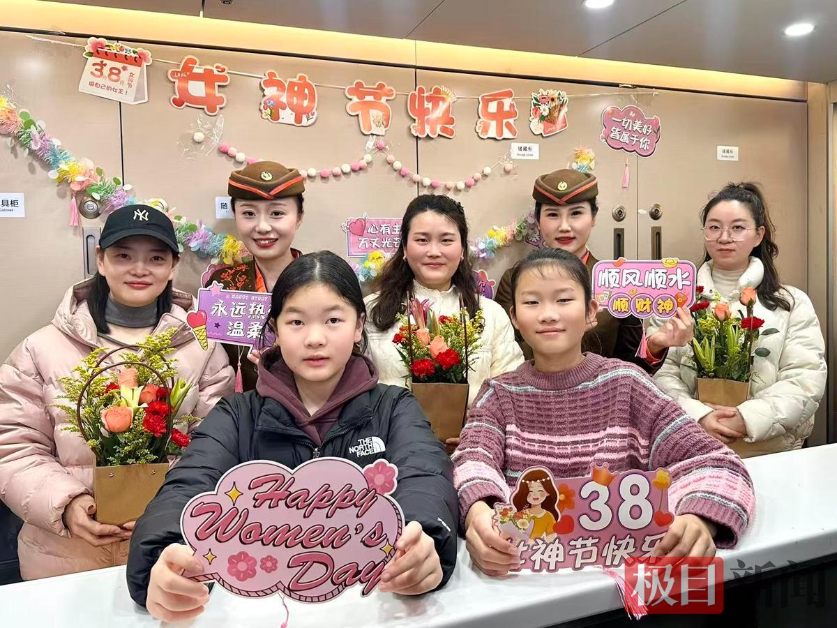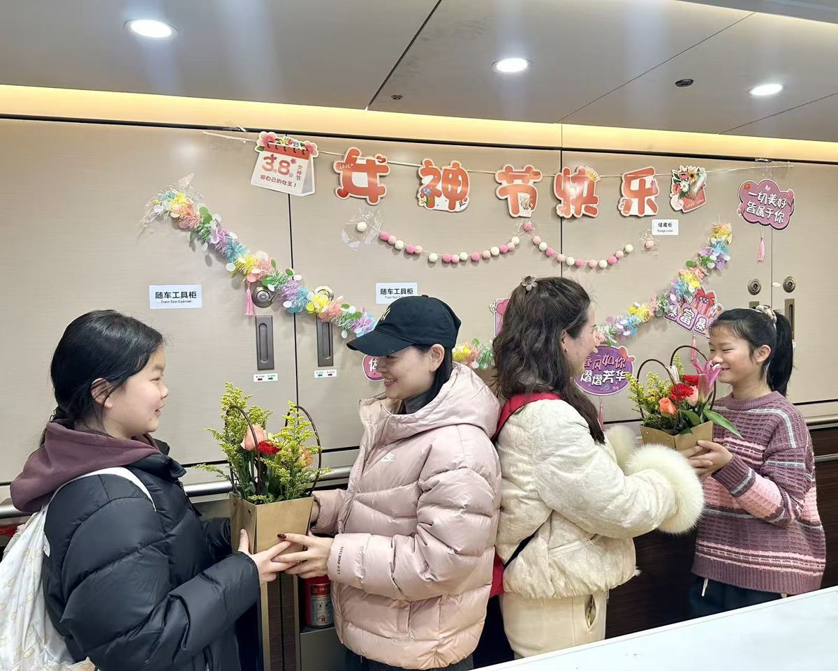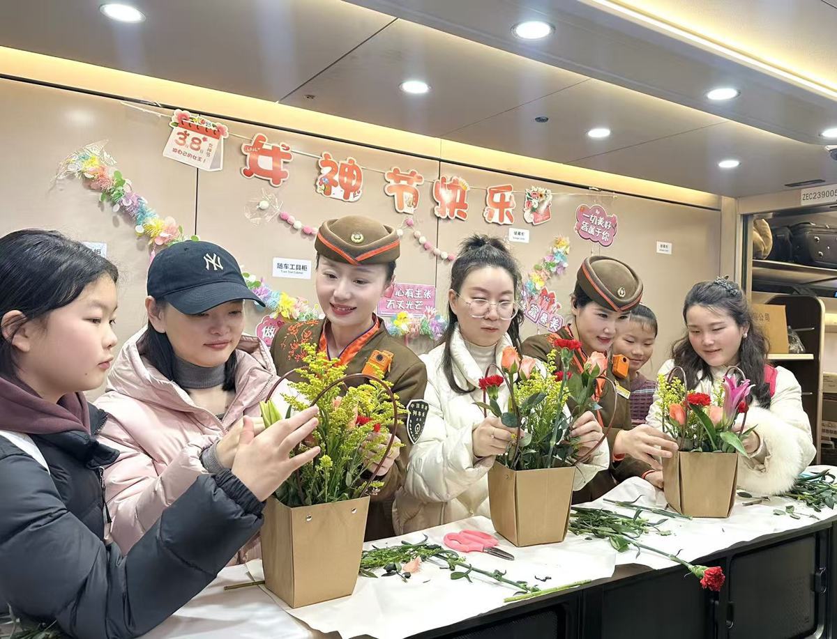 3月8日,在开往春天的C5076次列车上,武汉客运段汉口动车组车间“凤舞楚天”乘务组精心策划了一场别开生面的“春日花艺暖旅途”主题活动,为旅途中的女性旅客送上了一份特别的“三八”国际妇女节惊喜。