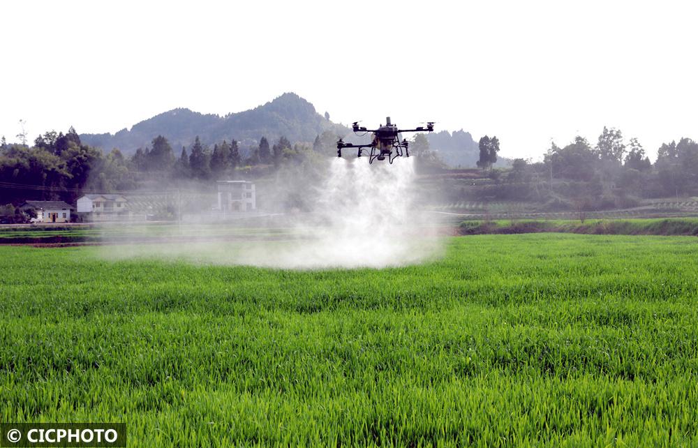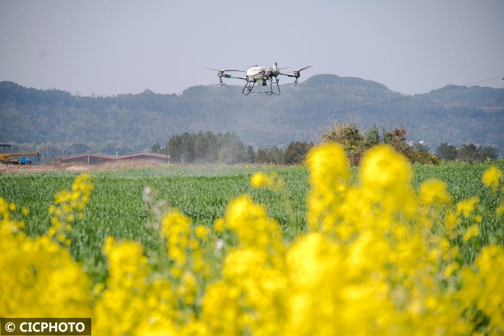 ↑2026年3月5日,种粮大户操作植保无人机在四川省巴中市通江县铁佛镇麦田里作业。CICPHOTO/程聪 摄