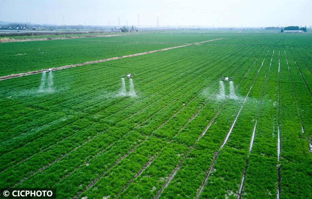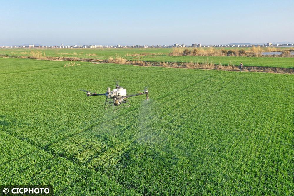 ↑2026年2月28日,搭载北斗导航系统的植保无人机在安徽省铜陵市普济圩农场的麦田里作业。(无人机照片)CICPHOTO/陈磊 摄