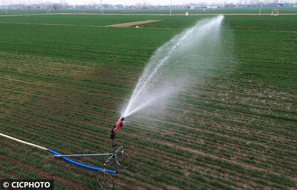 ↑2026年2月24日,在河南省许昌市建安区陈曹乡一处麦田里,农民利用喷灌设施为小麦浇水。(无人机照片)CICPHOTO/牛书培 摄